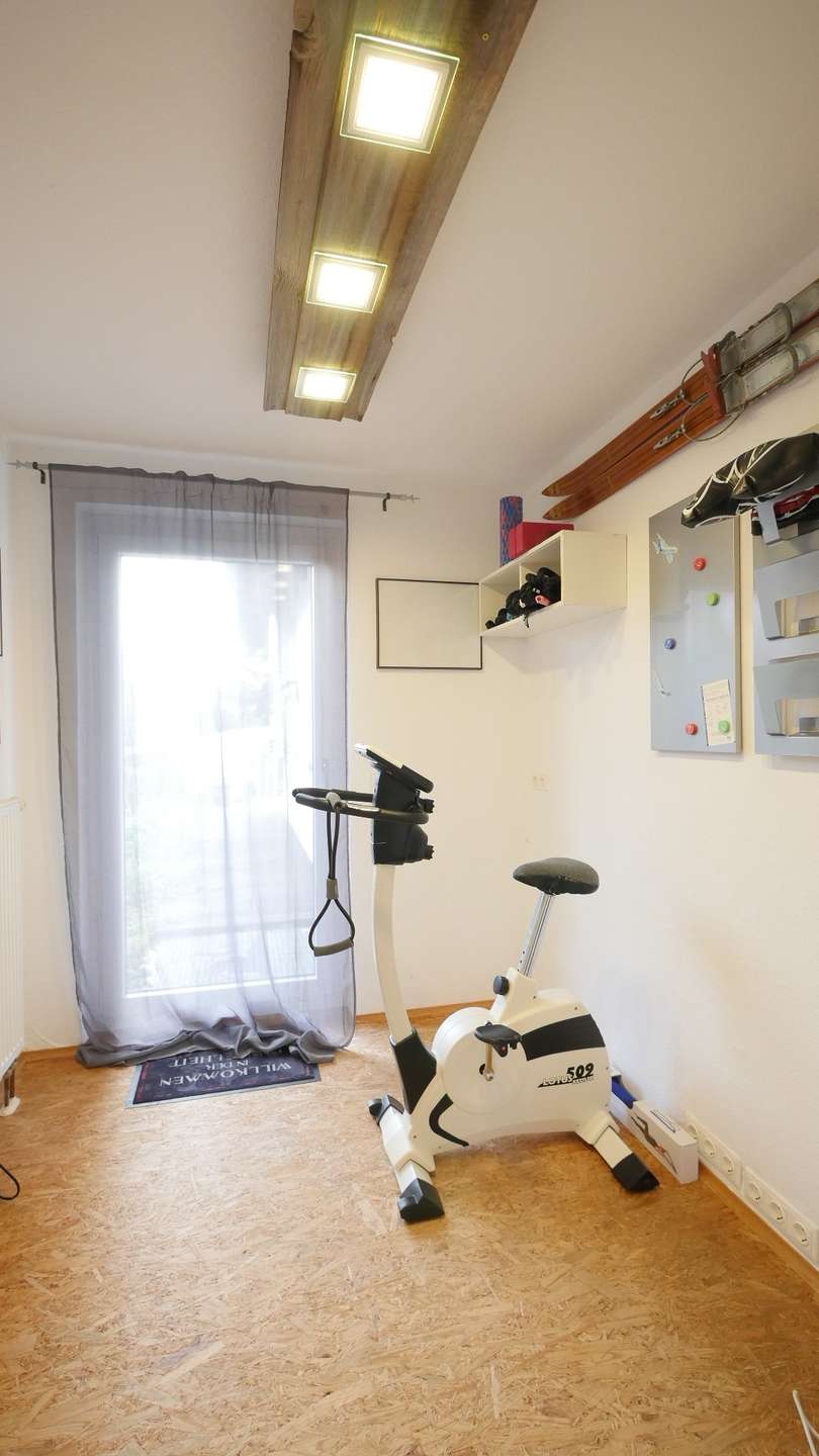 Das Arbeitszimmer, welches momentan als Fitnessraum genutzt wird verfügt über ausstreichend Platz einen Schreibtisch mit Sitzmöglichkeit und ein Wandregal aufzustellen.