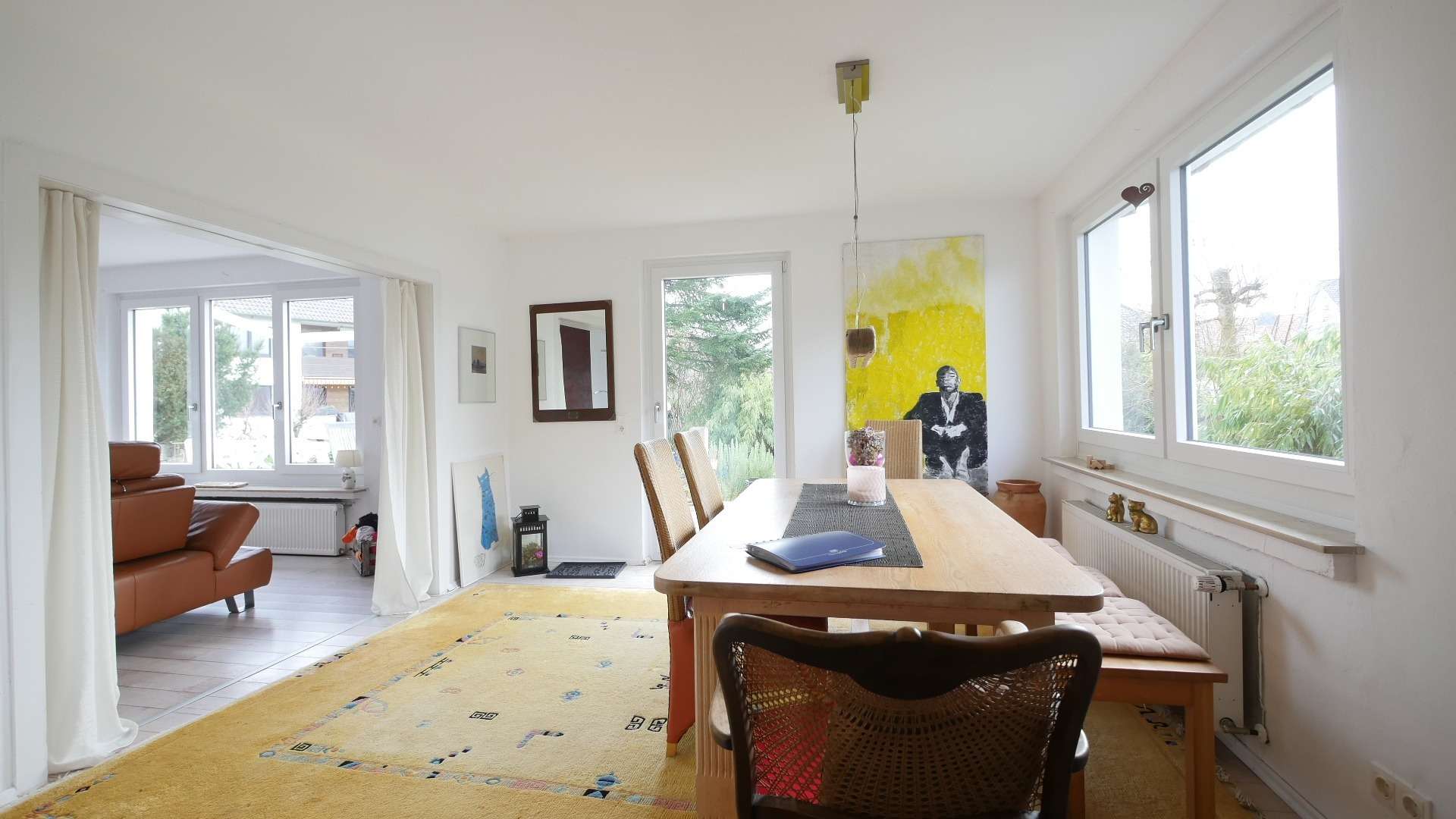 Es bietet einen direkten Zugang in das Esszimmer, hier steht ein großer Esstisch mit Sitzmöglichkeit bereit, sowie ein großer Teppich. Separate Vorhänge bieten die Möglichkeit das Esszimmer von dem Wohnbereich abzutrennen. Ebenfalls besteht durch eine Glastür direkter Zugang auf die Außenterrasse des Hauses.