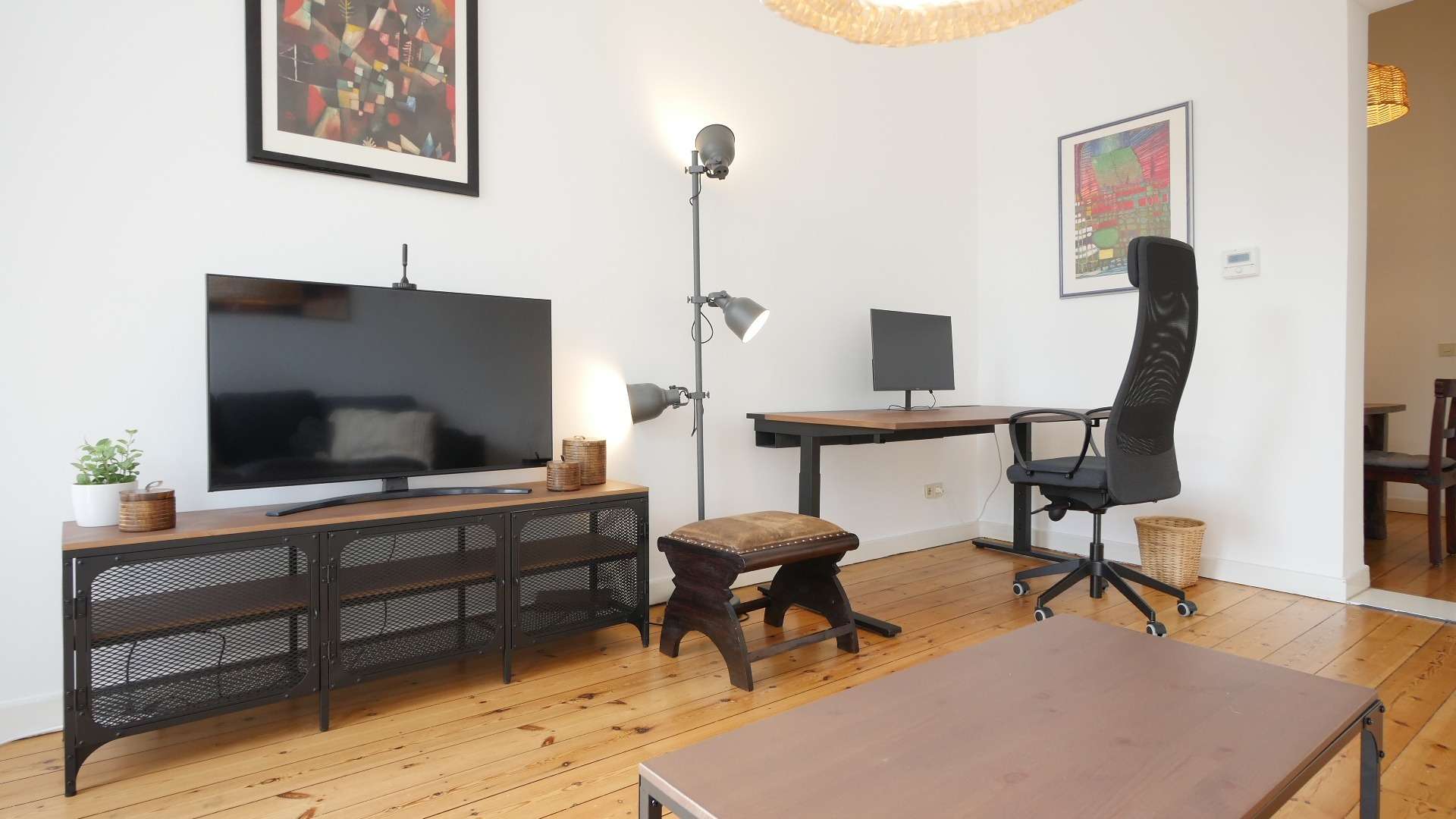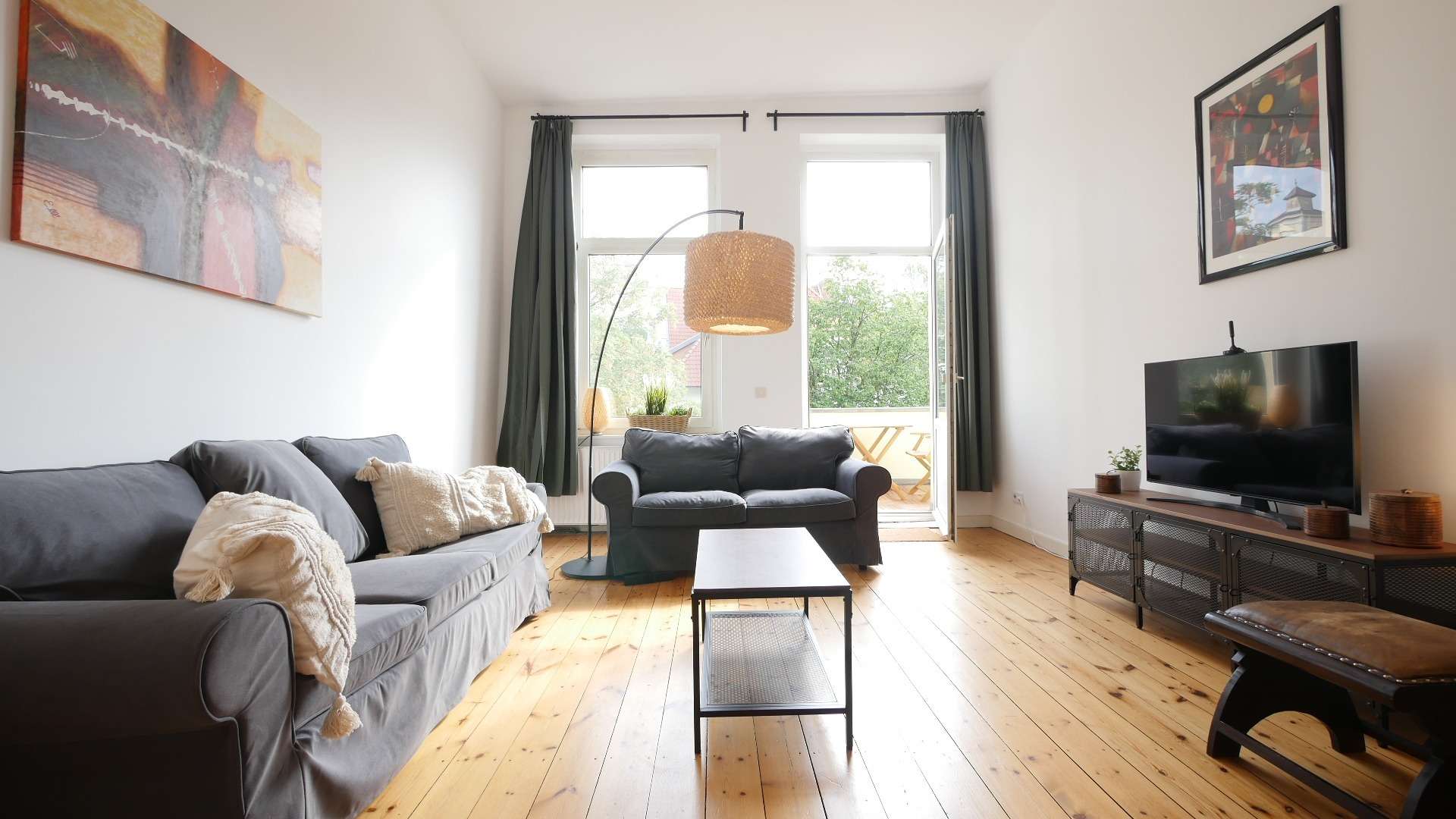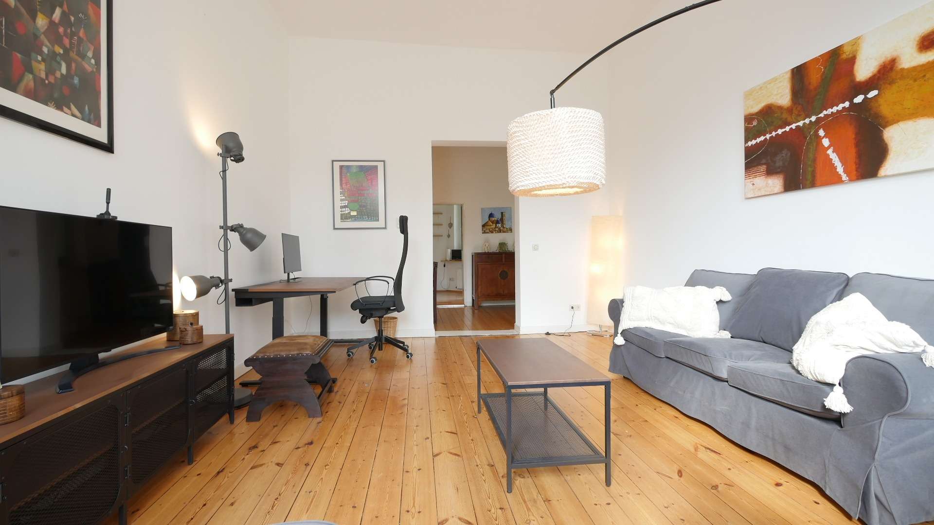Das Wohnzimmer ist möbliert mit einer großen Sofalandschaft, einem Wohnzimmertisch, einer Kommode, Teppich, Hängestehlampe, Sideboard und einem Flachbildfernseher. Hinzukommend steht zur Nutzung ein Schreibtisch und ein Schreibtischstuhl bereit. Zwei große Fenster erfüllen den hellen Raum mit Tageslicht.