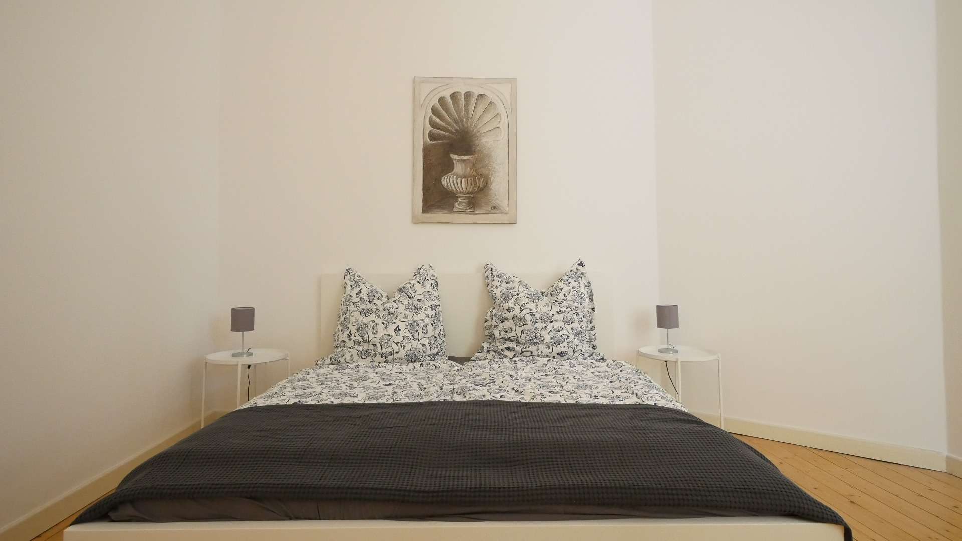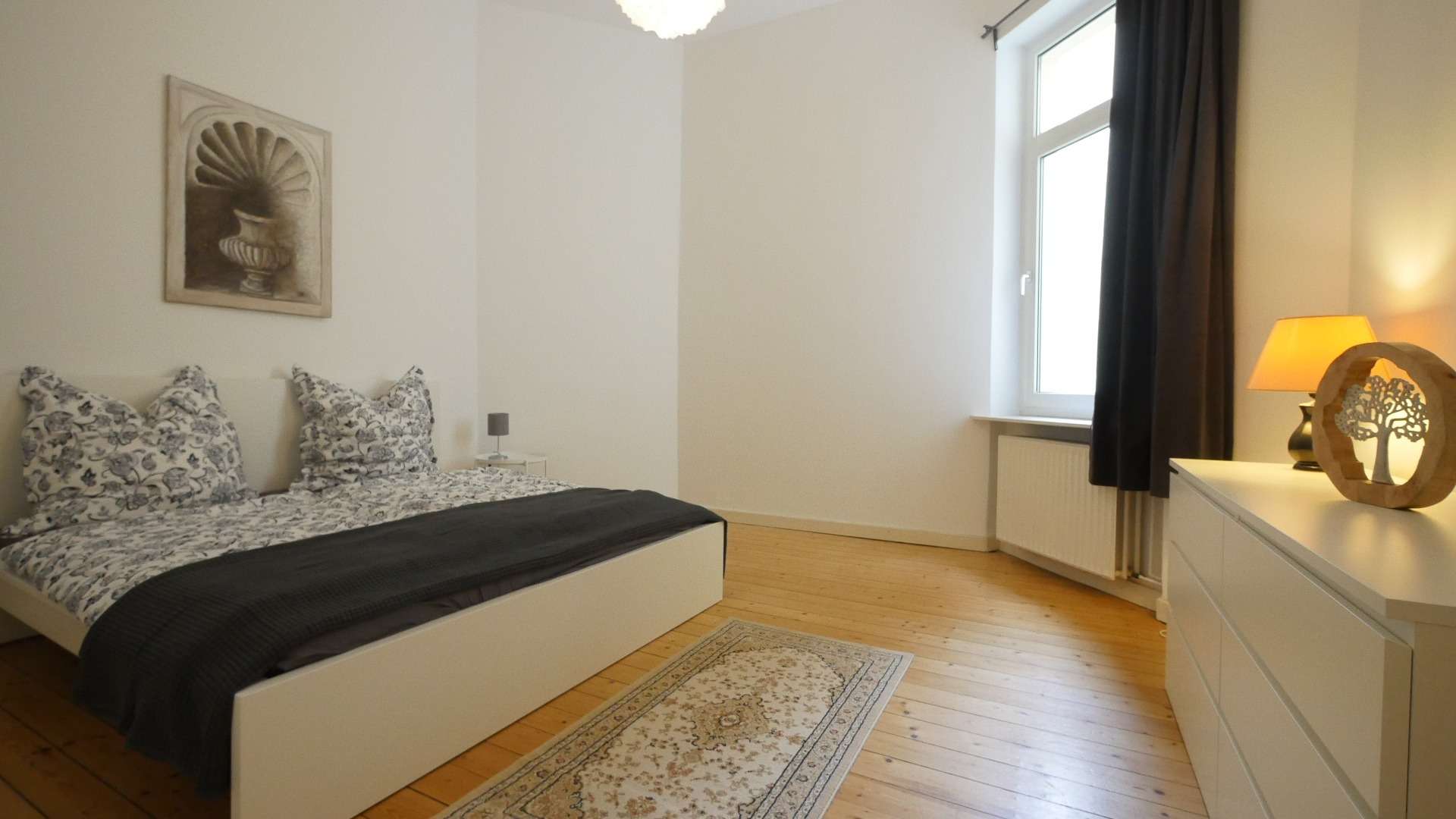 Das Schlafzimmer zum ruhigen Innenhof gerichtet ist eingerichtet mit einem Doppelbett, zwei Nachttischen mit Lampe, einem Kleiderschrank sowie einem Teppich vor dem Fußende des Bettes.