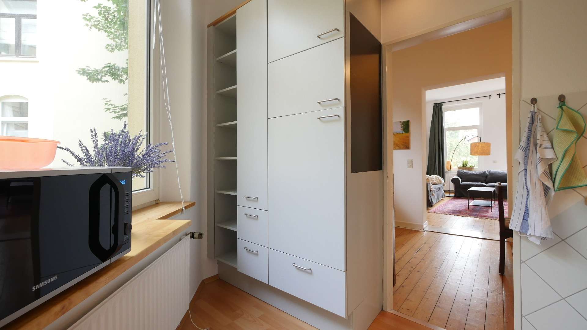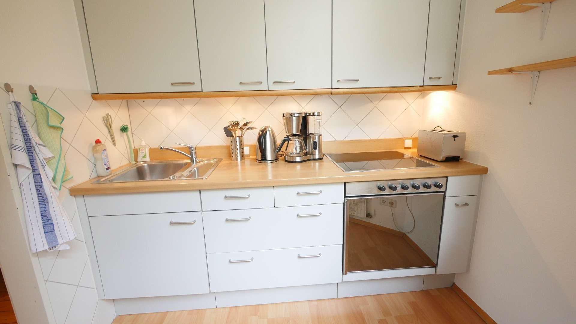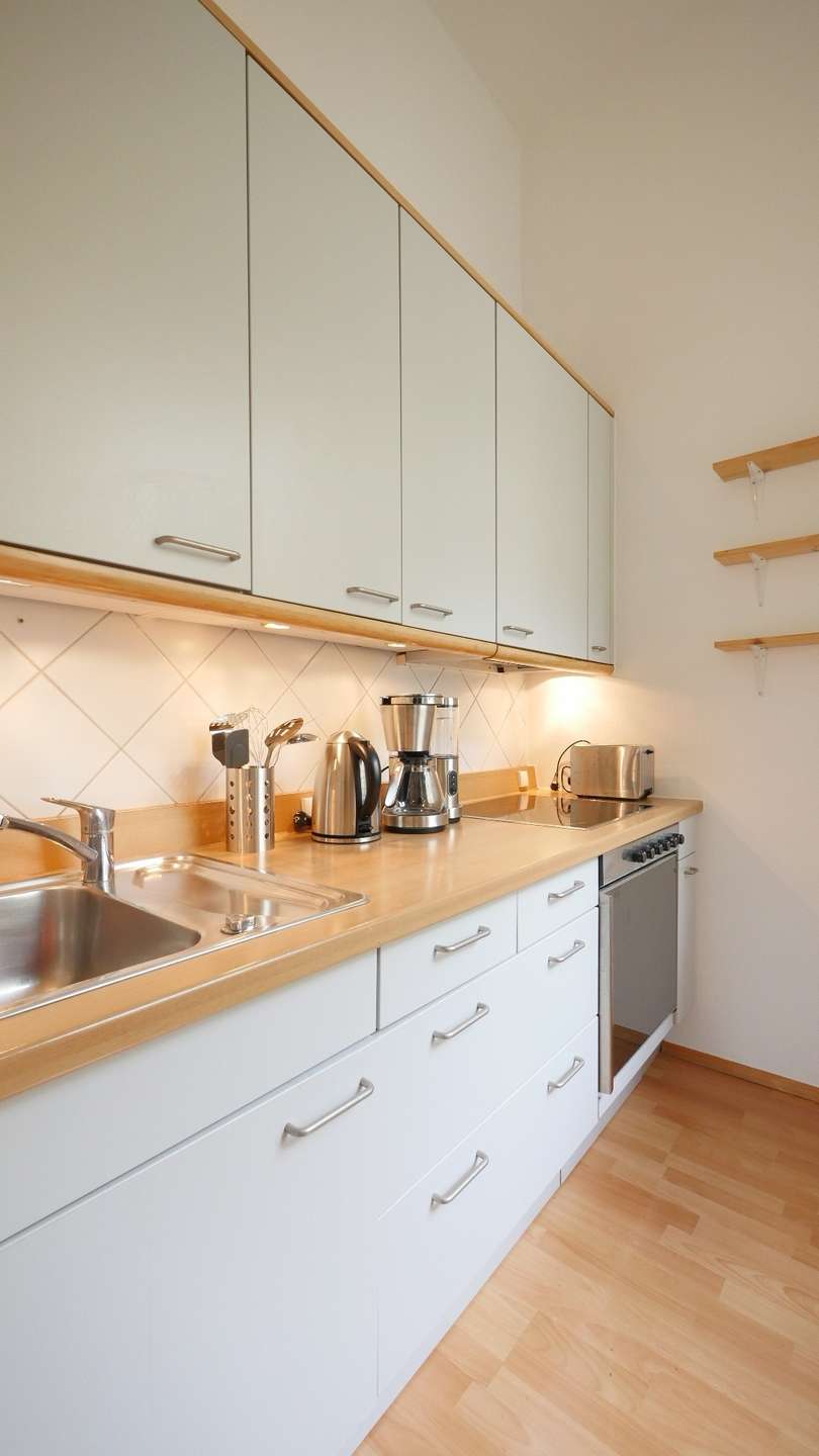 Die Wohnung verfügt über eine Einbauküche, diese ist mit einem Herd, einem Backofen, Mikrowelle, Kühlschrank, Kaffeemaschine und einem Wasserkocher ausgestattet. Sie bietet mit ihren Hängeschränken nutzbaren Stauraum und Platz für weitere Küchenutensilien.