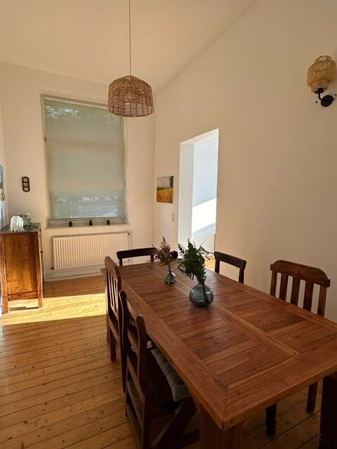 Das Esszimmer besticht durch einen großen Massivholztisch, der als zentrales Element des Raumes dient. Die von der Decke herabhängende Lampe sorgt für eine stimmungsvolle Beleuchtung. Die nebenstehende Vitrine schafft zusätzlichen Stauraum für Geschirr oder weitere Haushaltsgegenstände.