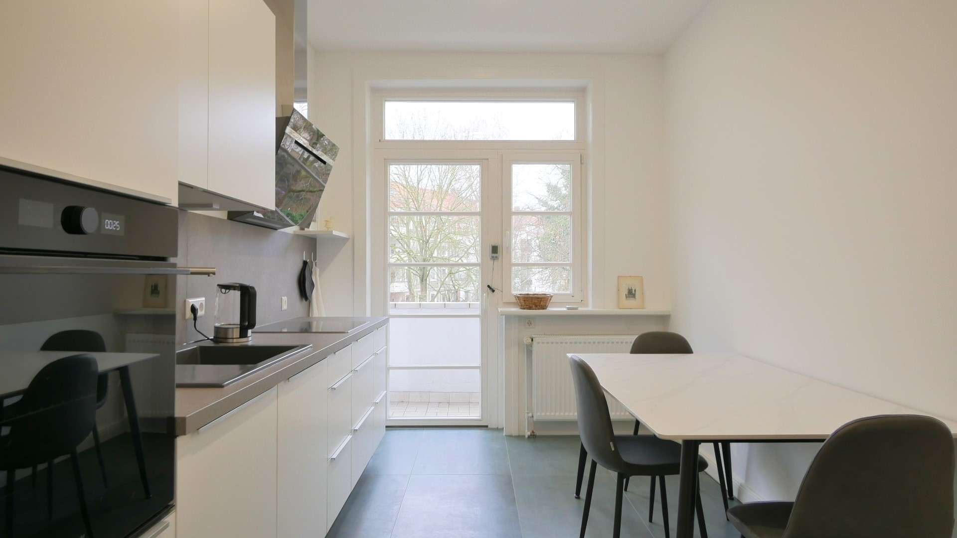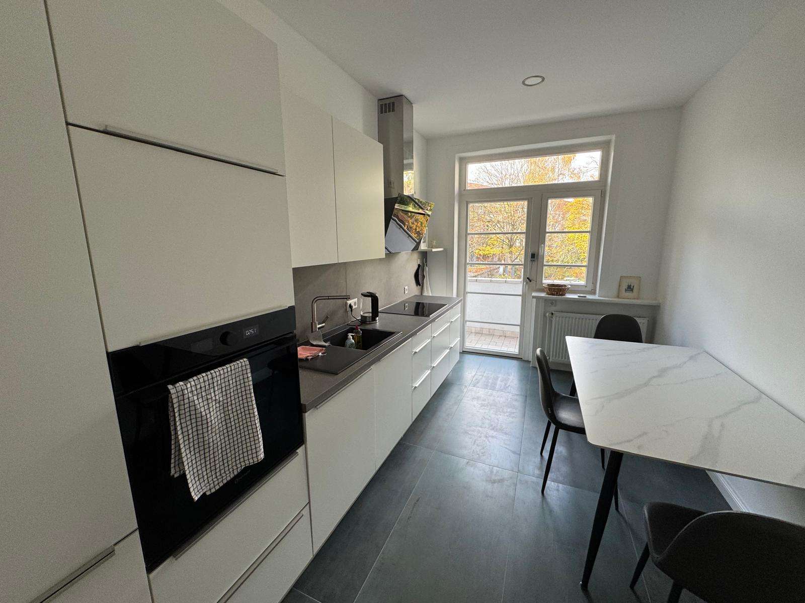 Die moderne Küche ist hochwertig ausgestattet mit zeitlosen Fronten, einer durchgehenden Arbeitsfläche sowie Backofen auf Stehhöhe, 4-Platten-Kochfeld, Dunstabzugshaube, Kühl-/Gefrierkombination und Spülmaschine. Ein zusätzlicher Esstisch mit zwei Stühlen ergänzt den Küchenbereich. Der zweite Balkon ist direkt von der Küche aus zugänglich und zum ruhigen Innenhof gelegen.