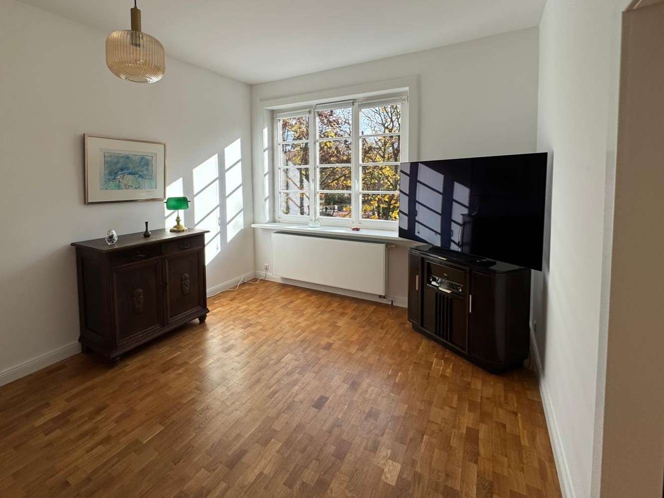 Große Fensterflächen und der Parkettboden im englischen Verband schaffen in den Wohnräumen eine angenehme und einladende Atmosphäre.