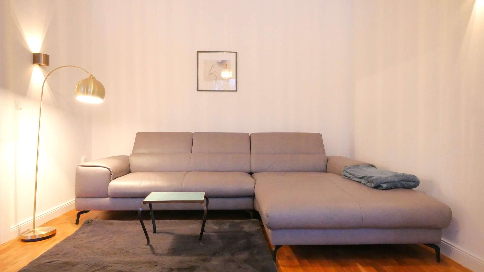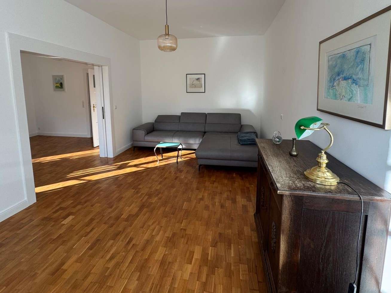 Der großzügige Wohn-/Essbereich bildet das Herzstück der Wohnung. Er ist mit einem großen, modernen Sofa mit Recamiere ausgestattet und bietet ausreichend Platz zum Entspannen. Stilvolle Einzelmöbel, eine klassische Kommode sowie dezente Beleuchtung runden das wohnliche Gesamtbild ab.