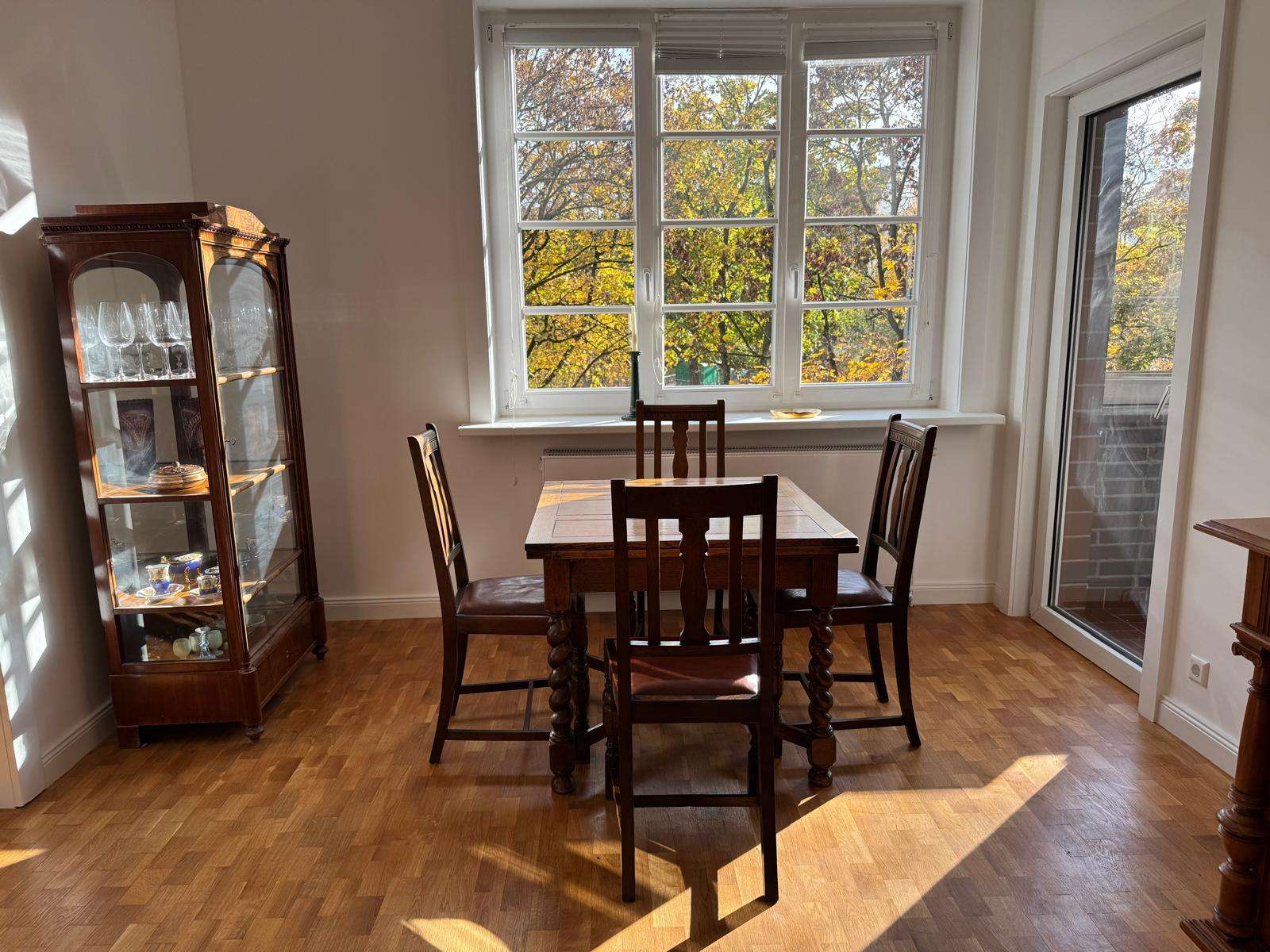 Der Essbereich verfügt über einen massiven Holztisch mit vier Stühlen sowie eine elegante Vitrine. Von hier aus ist der erste Balkon begehbar.