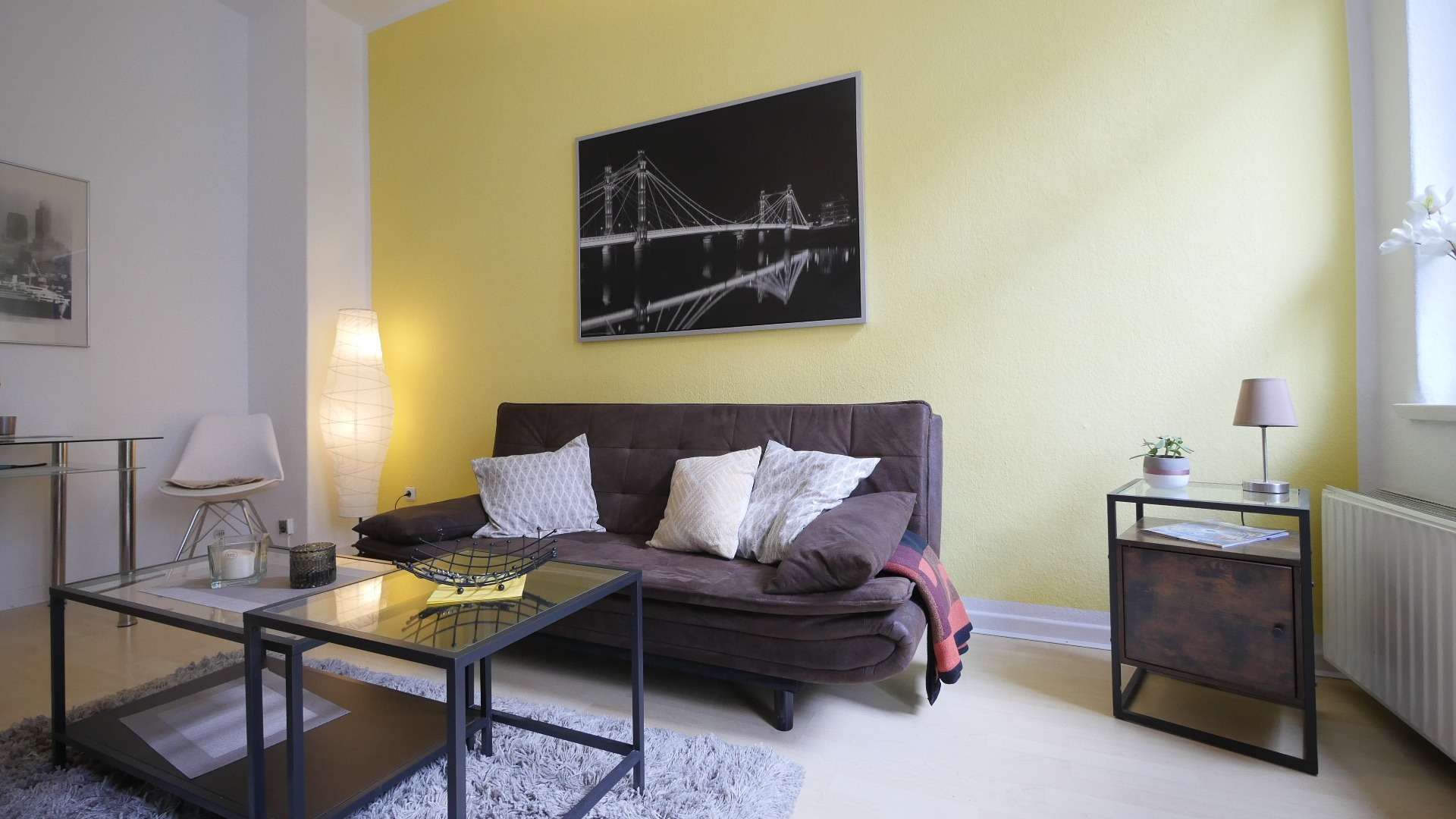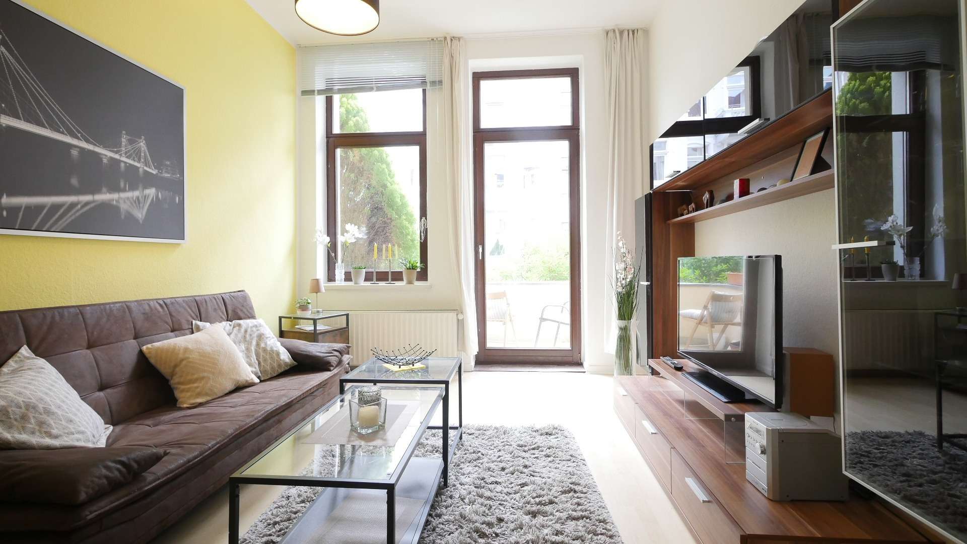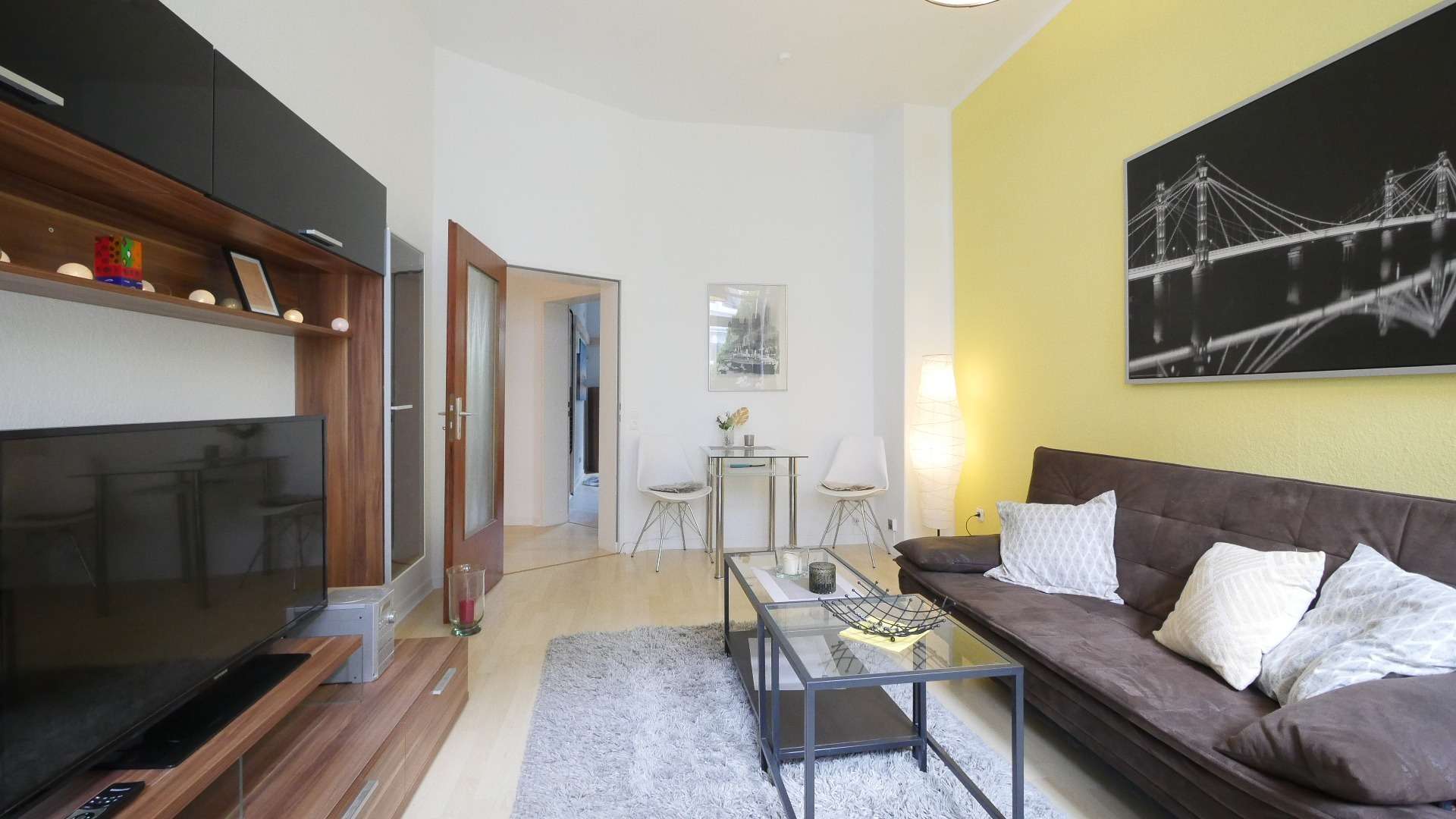 Das einladende Wohnzimmer ist mit einem Lowboard-Regal-Komplex mit Flachbild TV, Schlafsofa mit Beistelltisch und einem Glasesstisch mit zwei Stühlen eingerichtet. Von hier kann der schöne Balkon betreten werden.