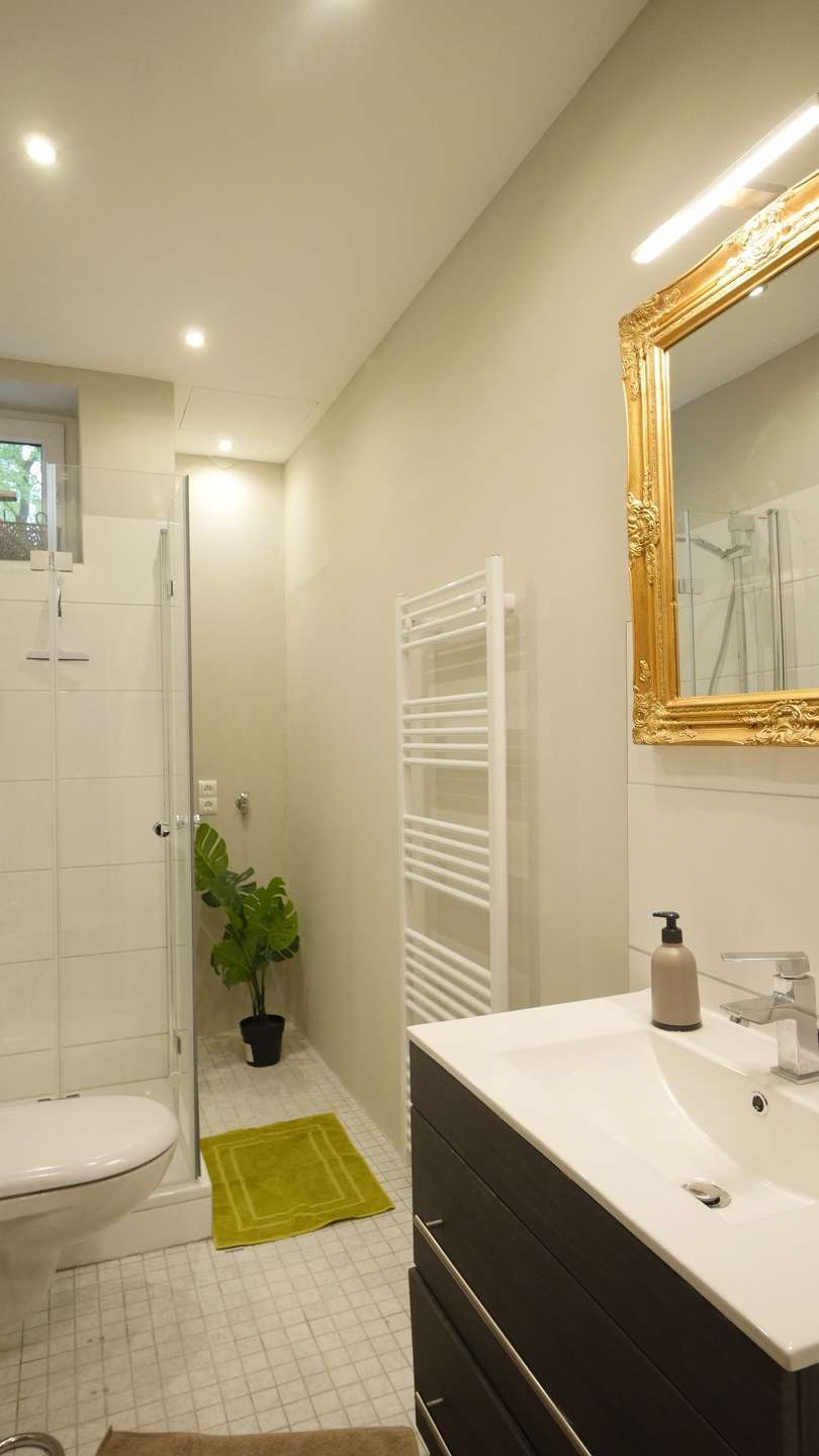 Das Badezimmer ist mit einer Eckdusche mit Glastüren, WC, Waschmaschine und Waschbecken ausgestattet.