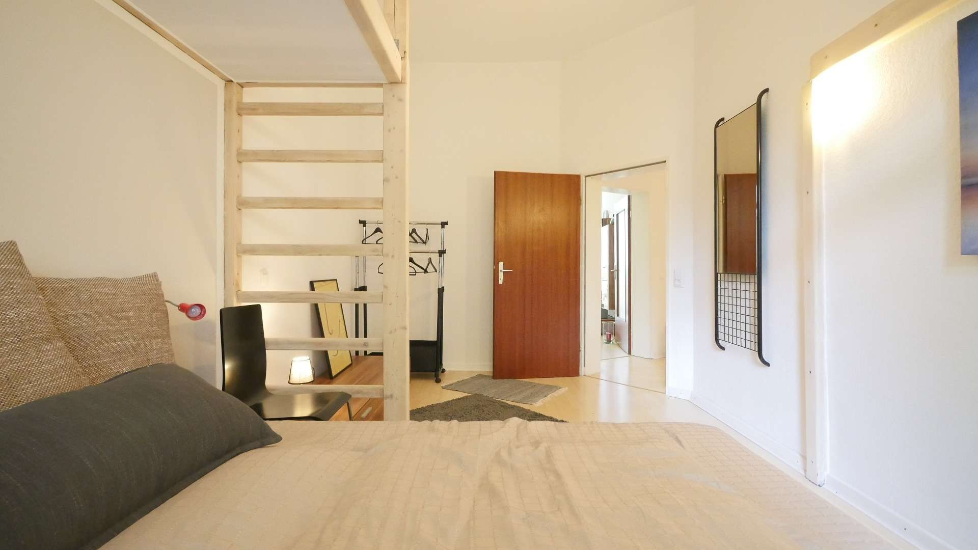 Das Schlafzimmer verfügt über ein breites Doppelbett, Kleiderschrank und Lowboard. Eine Hochebene mit Leiter bietet eine besondere Möglichkeit für einen Lese-/Entspannungsbereich.