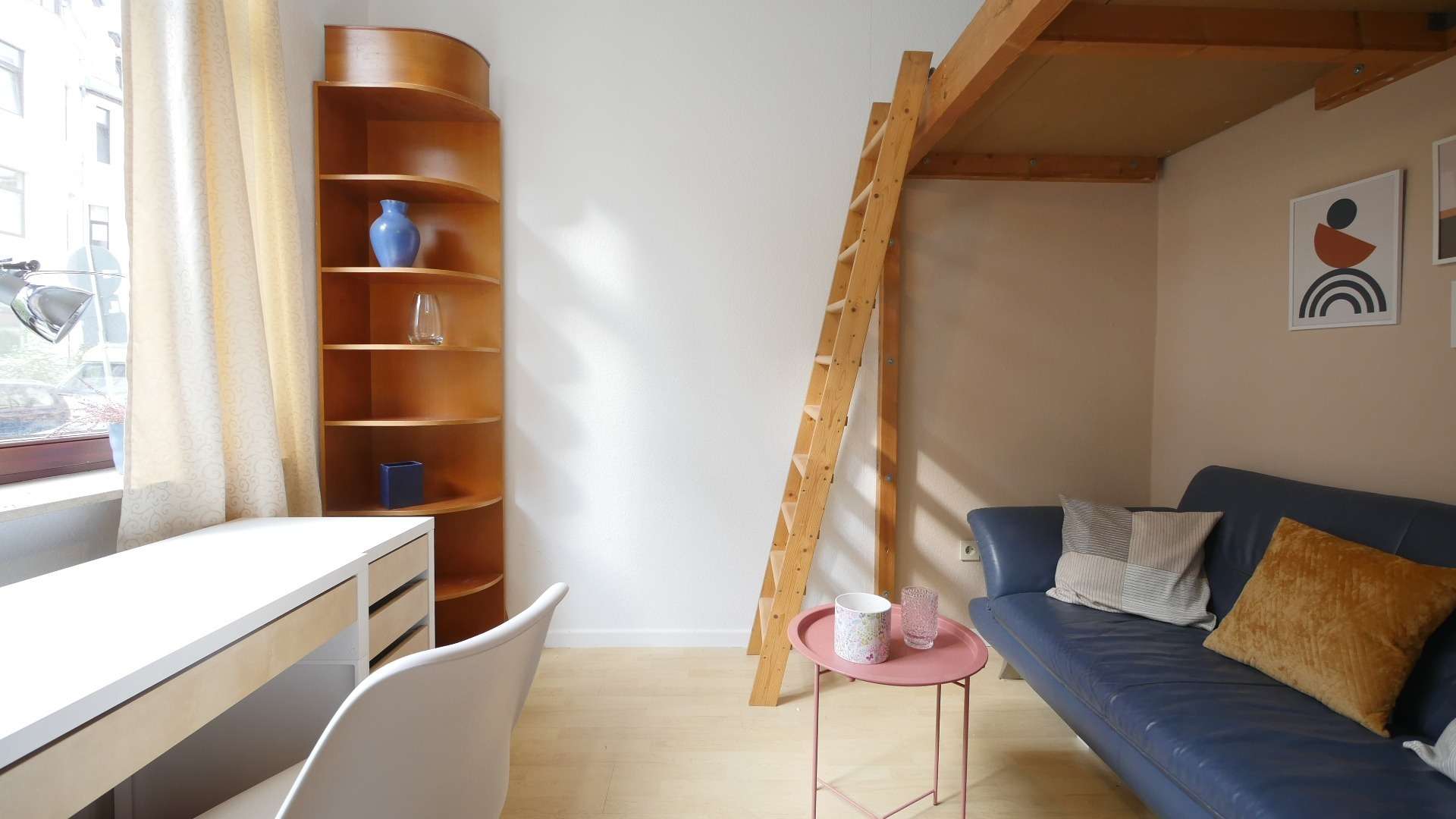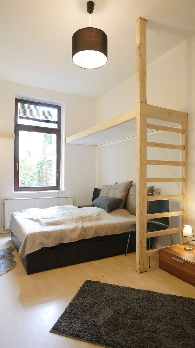 Das drittes Zimmer ist mit einem Schreibtisch, Regal, Ledersofa und Hochbett ausgestattet.