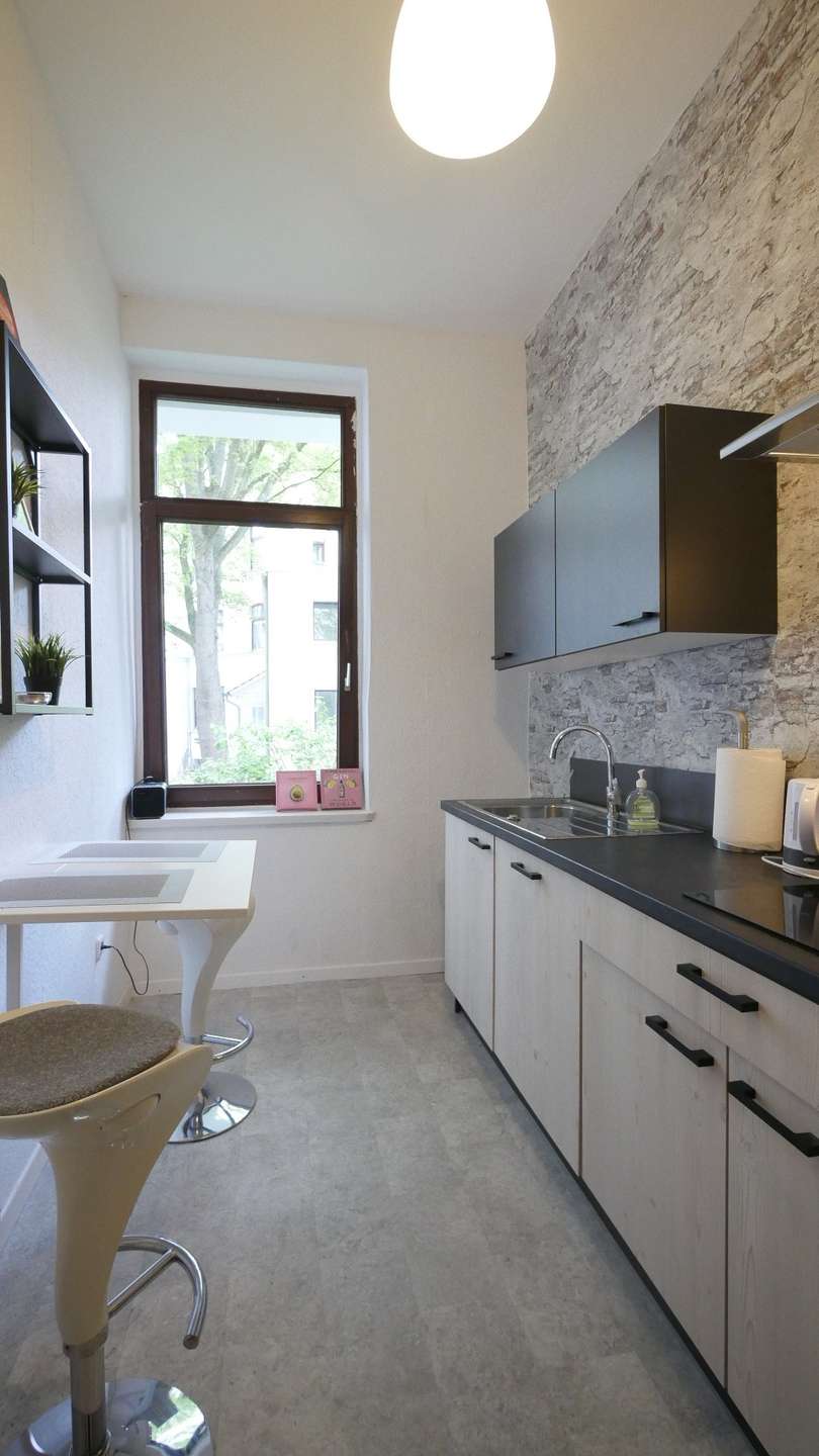 Die schicke Küche mit moderner Steinwand ist mit einer Einbauküchenzeile und einem Frühstückstisch mit Barhockern eingerichtet. Ausgestattet ist sie mit Ceranherd, Dunstabzugshaube, Backofen, Geschirrspülmaschine, Kühlschrank mit Gefrierfach und allen erforderlichen Küchenutensilien.