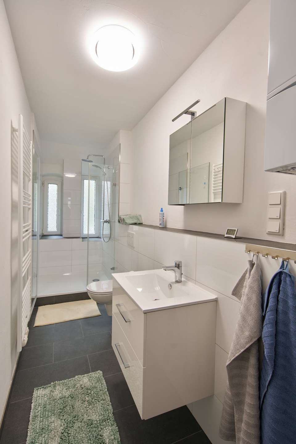 Das Tageslichtbad bietet zwei Fenster, eine bodentiefe Regendusche, WC, Waschbecken mit Unterschrank, Spiegel und Handtuchheizung.