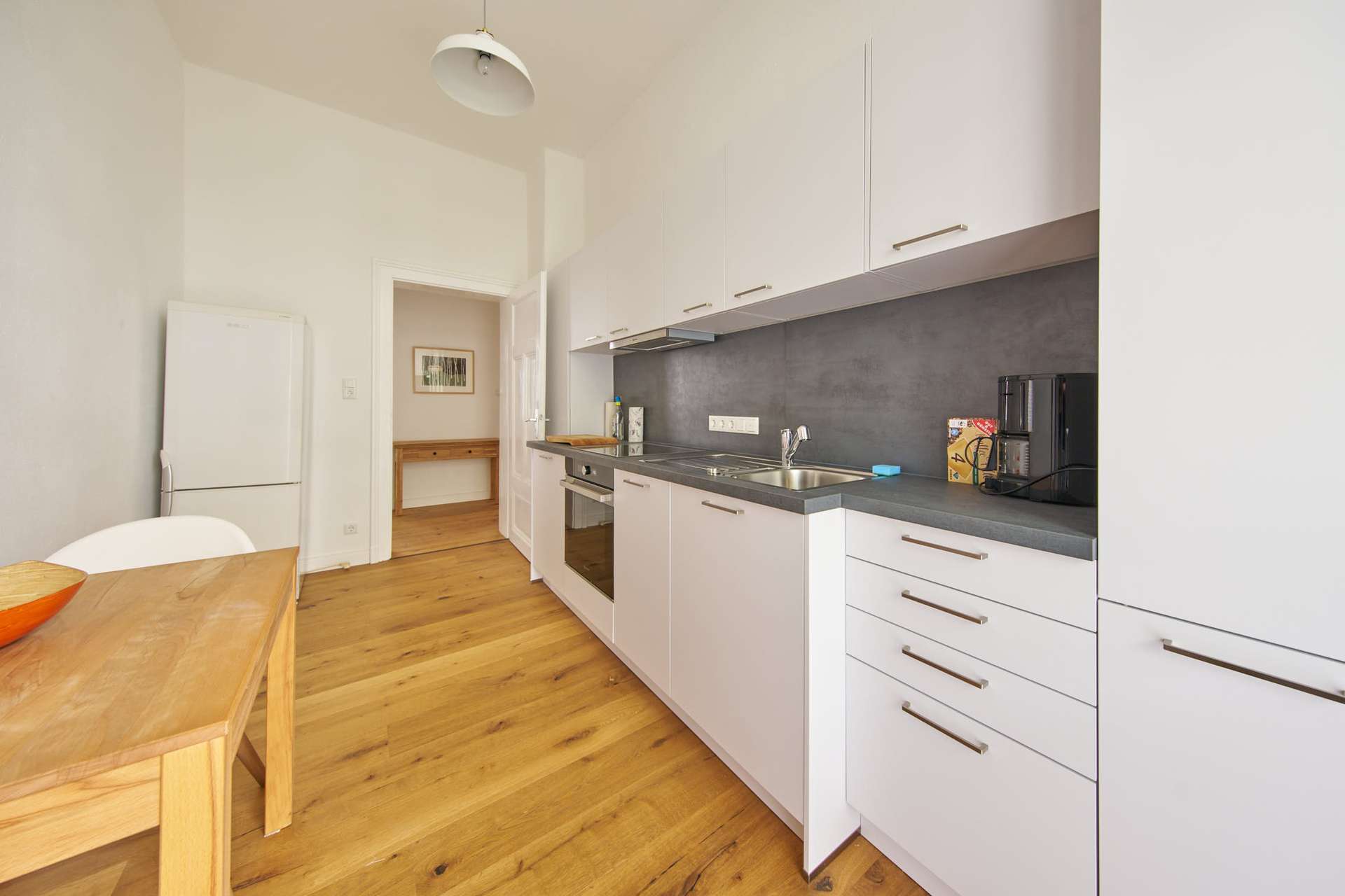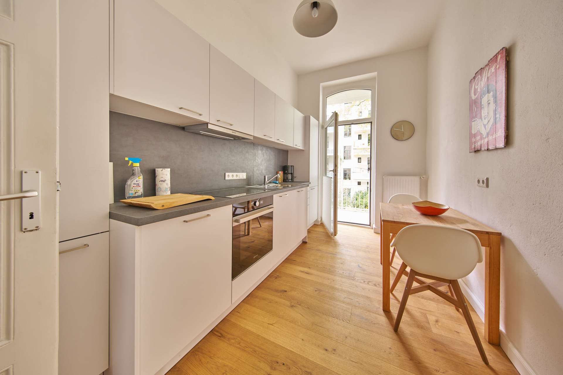Die helle Küche ist mit einer modernen Einbauküche inklusive Geschirrspüler, Herd, Backofen, Kühl-Gefrierkombination, Mikrowelle, Radio und Esstisch ausgestattet.