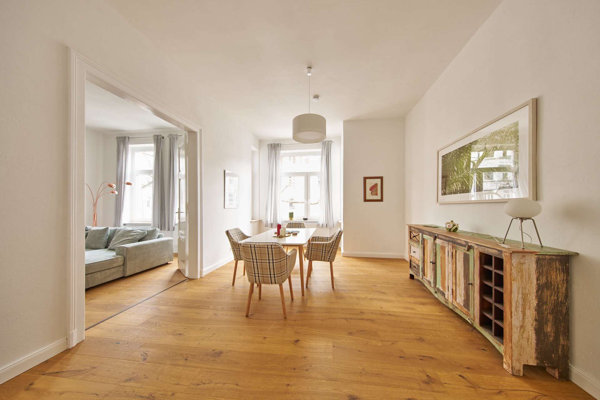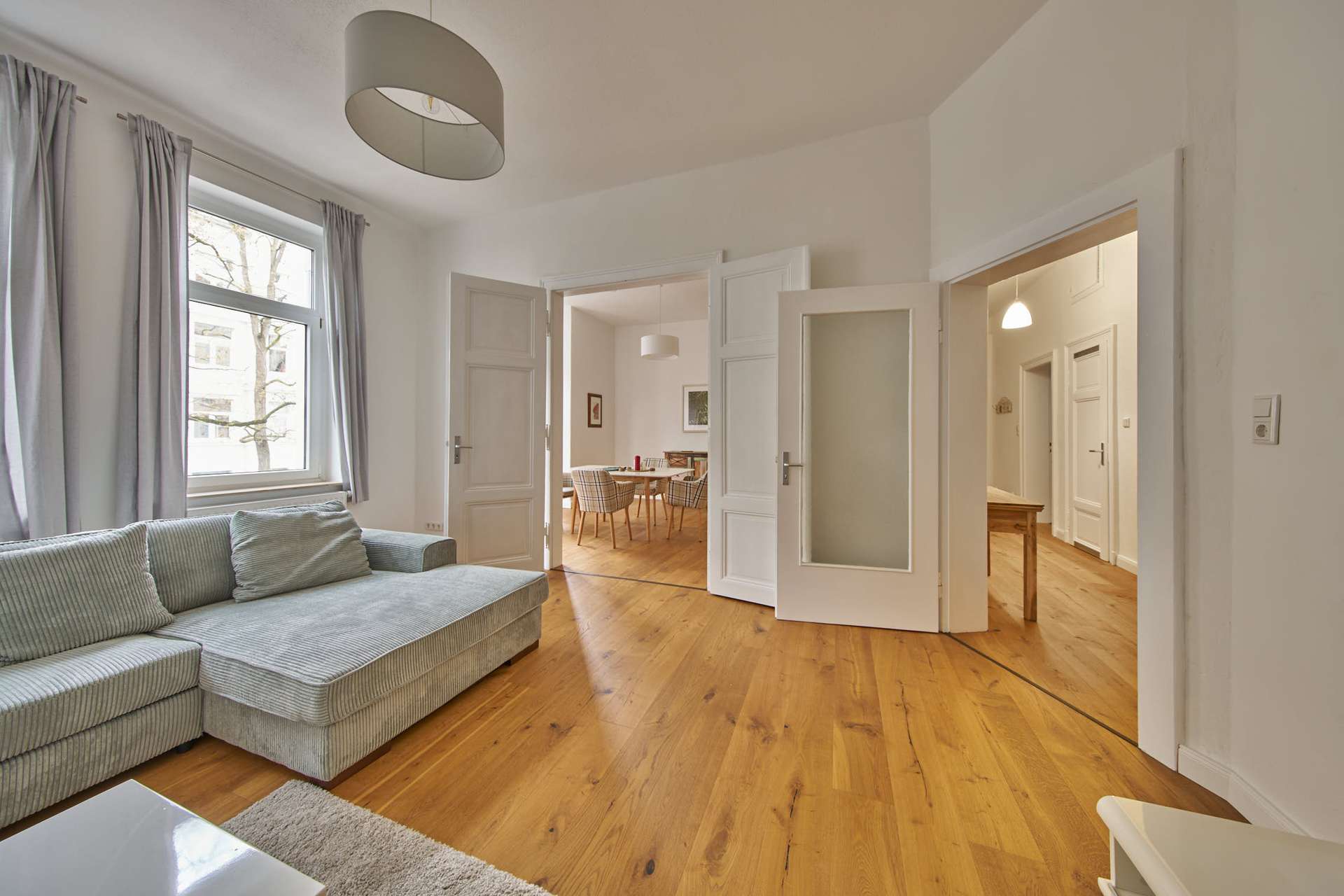 Nach Süden ausgerichtet liegen das gemütliche Wohnzimmer und das angrenzende Esszimmer mit Erker, verbunden durch große Flügeltüren. Beide Räume sind geschmackvoll eingerichtet, u. a. mit einem Cord-Ecksofa, einem Esstisch aus Holz, Vitrine, Fernseher, kleiner Musikanlage und Teppich.