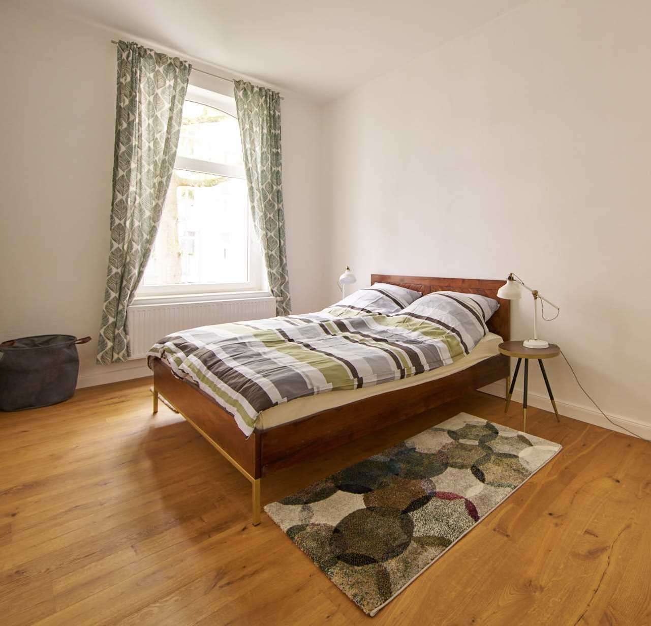 Zwei weitere Schlafzimmer – eines größer, eines kleiner – liegen ruhig zum Innenhof. Das Hauptschlafzimmer verfügt über ein Doppelbett, Nachttische, Kleiderschrank und Teppich. Das kleinere Zimmer ist mit Einzelbett, Schreibtisch, Nachttisch und Kleiderschrank ideal als Arbeits- oder Gästezimmer nutzbar.