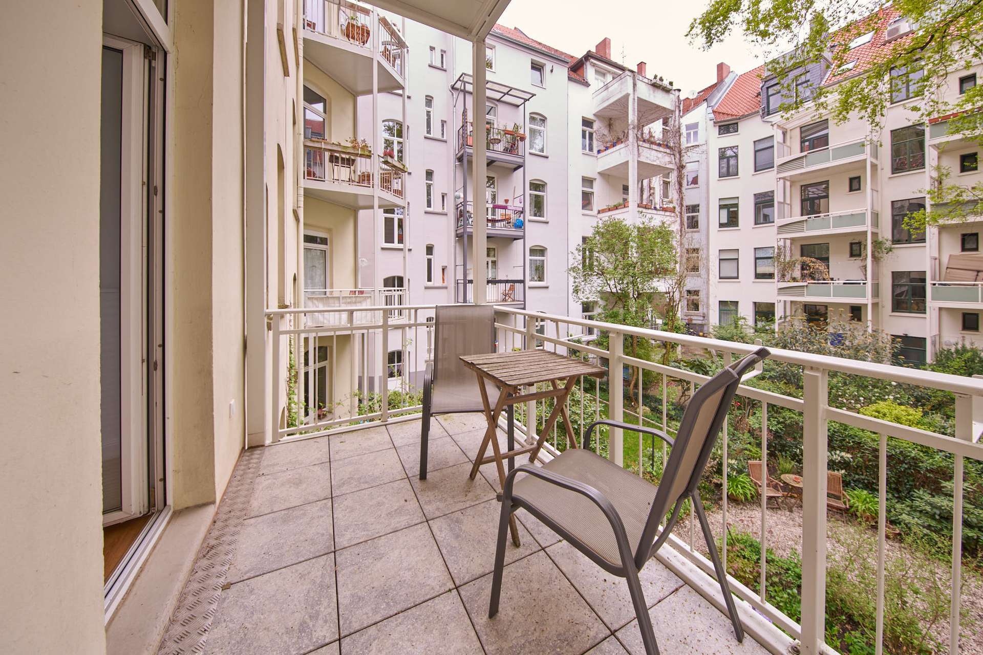 Von hier aus gelangt man auf den Balkon mit Blick in den grünen Innenhof.