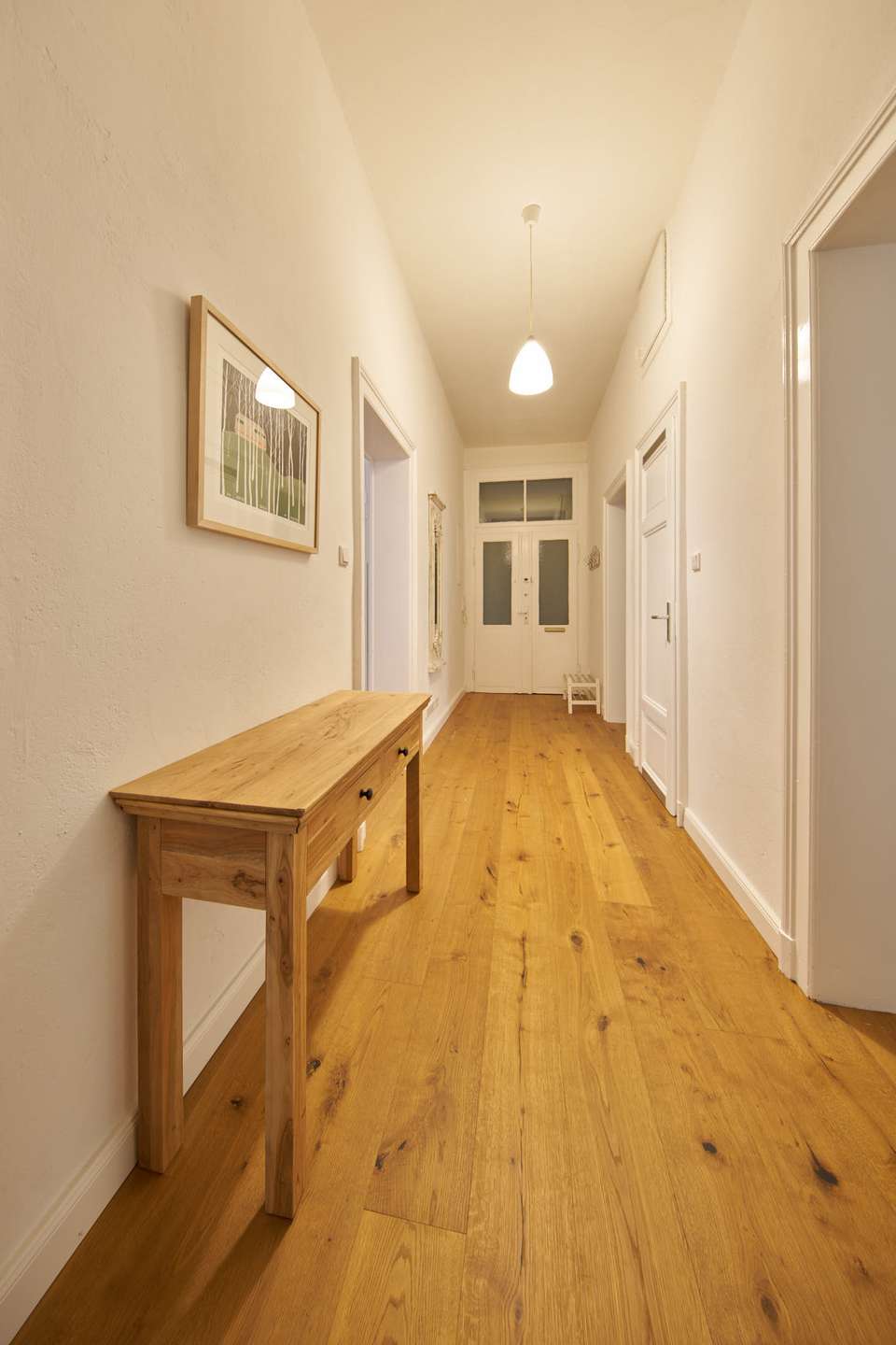 Mit ca. 3,50 m hohen Decken, hochwertigem Echtholzparkett und großen Fenstern bietet sie ein helles, klassisches Wohnambiente. Das gepflegte Treppenhaus mit Terrazzoböden und gedrechseltem Geländer führt zur zentral gelegenen Diele, von der aus alle Räume erreichbar sind.
