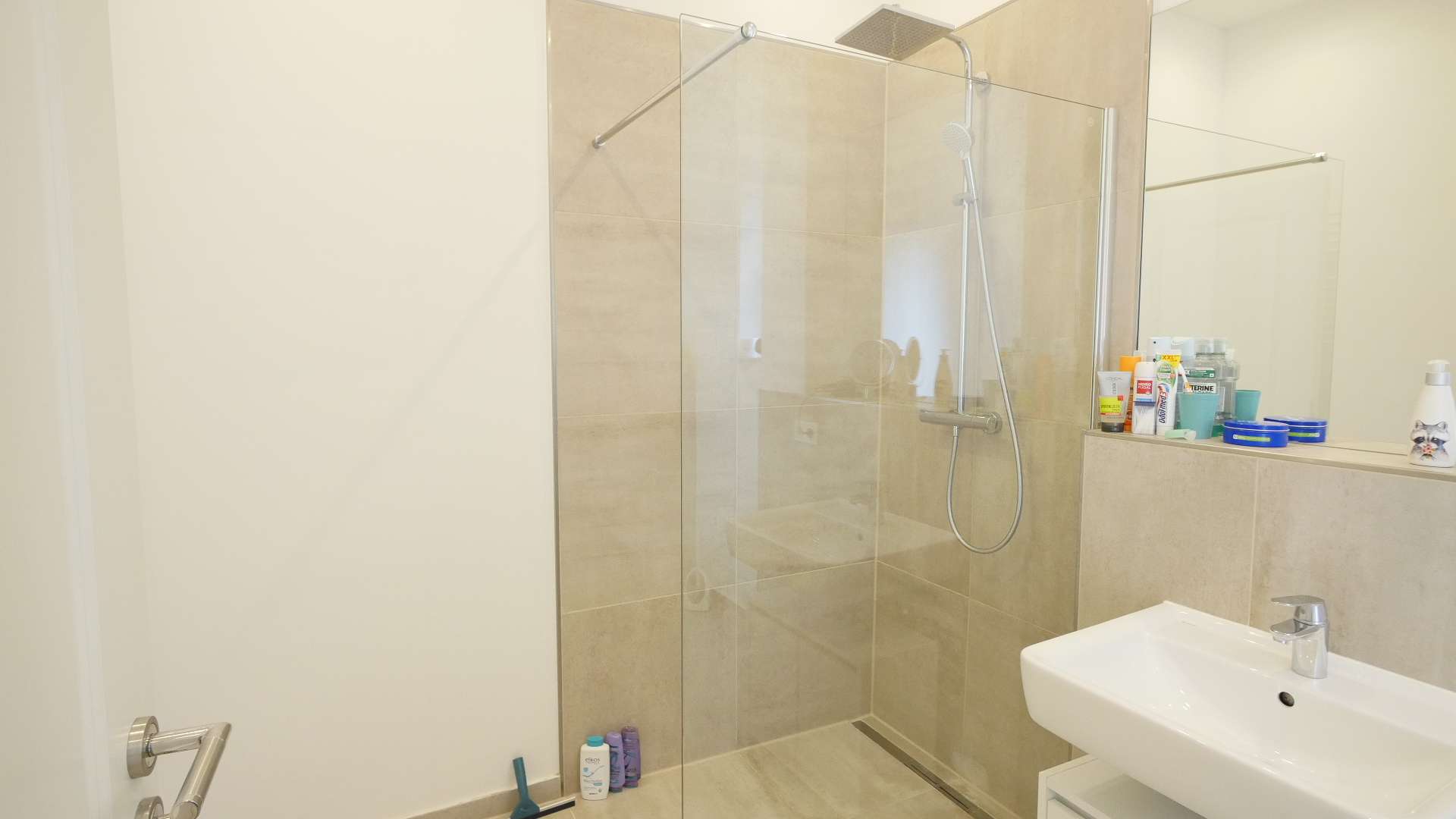 Das Schlafzimmer mit Bett, Kleiderschrank, Schreibtisch und Nachtisch, ebenso das moderne Bad mit ebenerdiger Dusche, Waschtisch und WC.