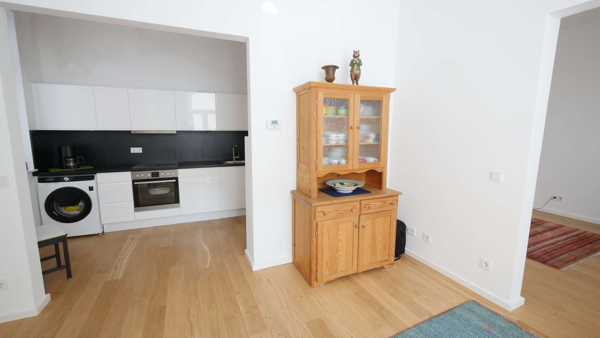 Die Einbauküche ist hochwertig ausgestattet mit Waschmaschine, Geschirrspüler, 4-Platten-Ceranfeld, Backofen, Kühl-/Gefrierschrank und allen erforderlichen Küchengeräten,.