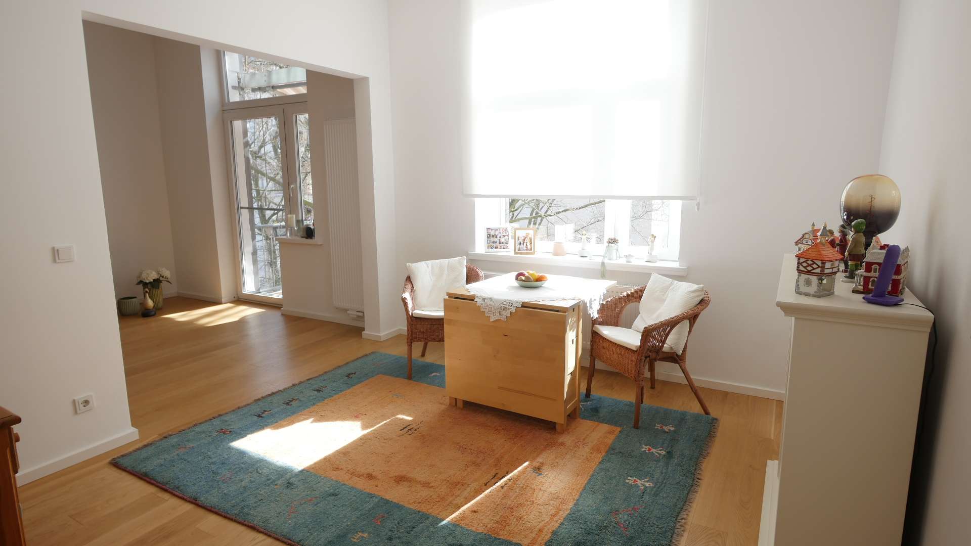 Wohnzimmer, Essbereich und Küche befinden sich in einem hellen, offenen Raum. Hier ist auch der Zugang zum schönen, großen Balkon mit Balkonmöbeln.