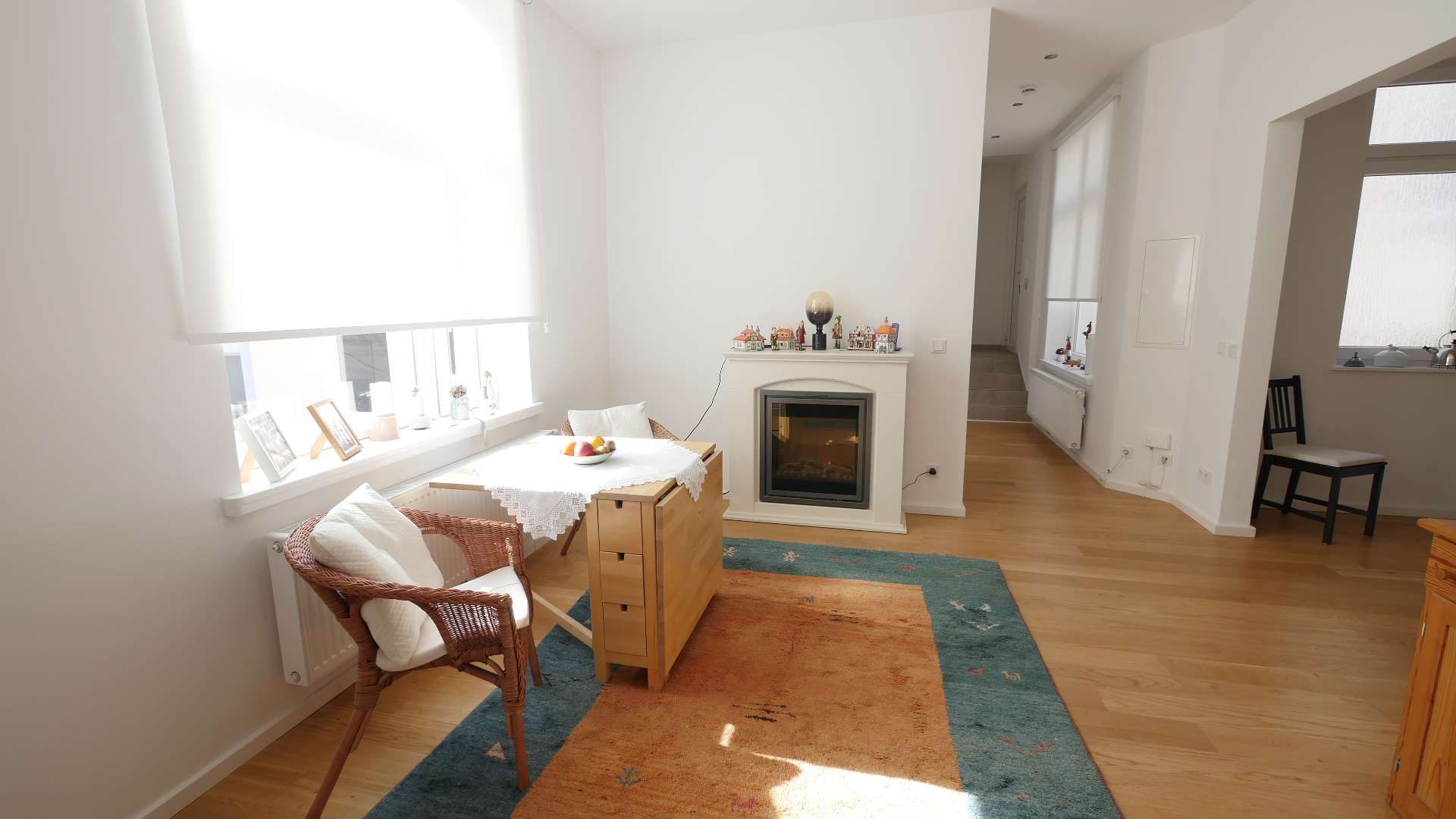 Der Wohnbereich ist mit einem Ledersofa, Fernseher, großem Spiegel sowie einem Esstisch mit 2 Stühlen ausgestattet. Hier befindet sich auch der schöne Kamin.