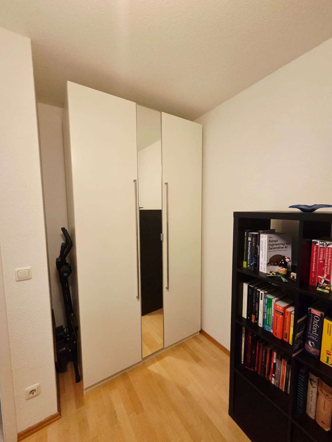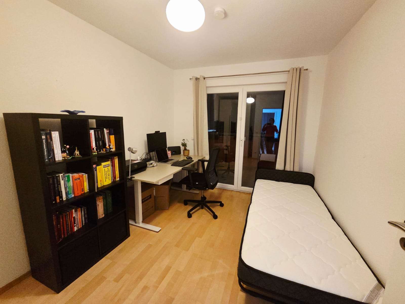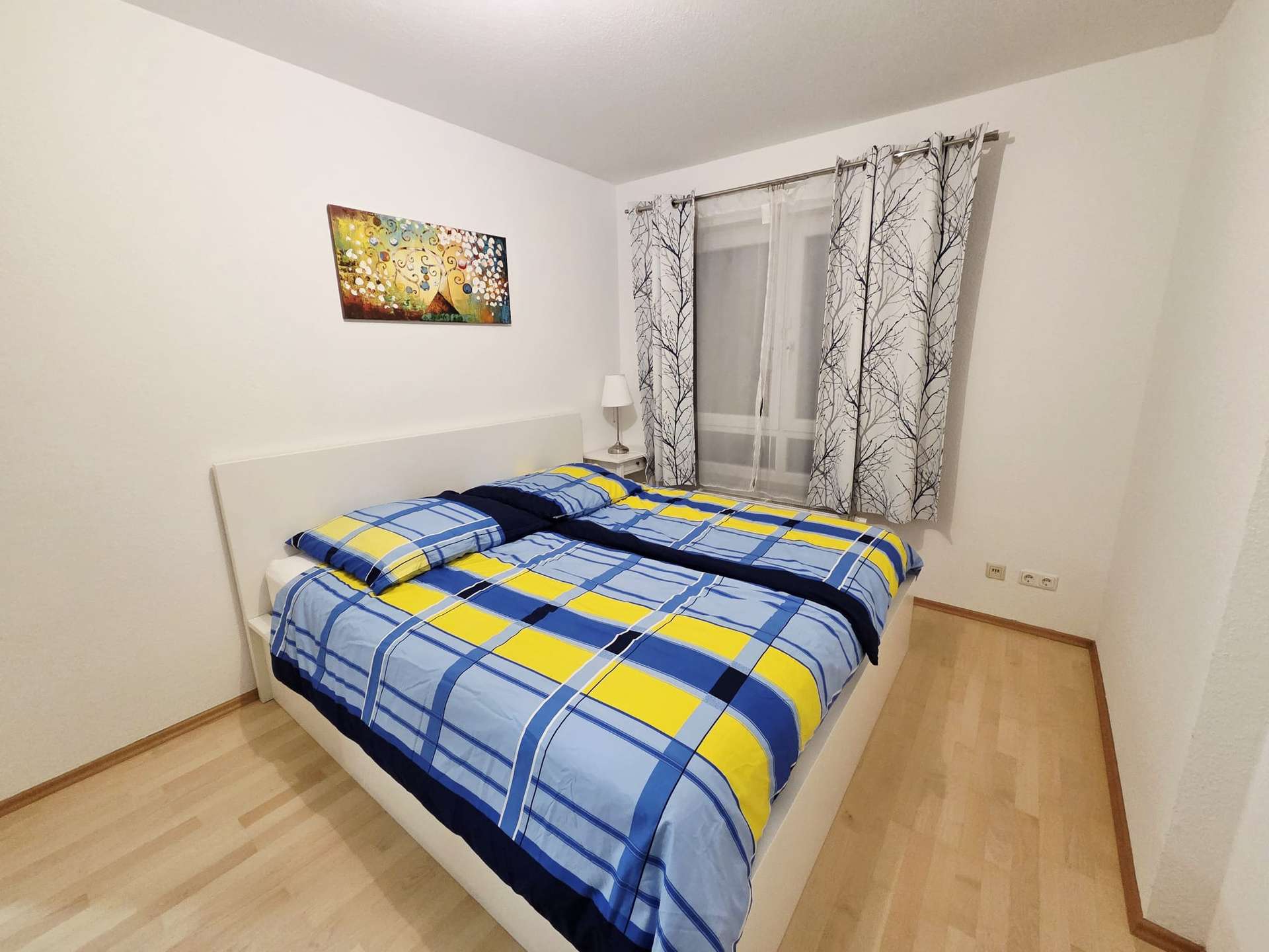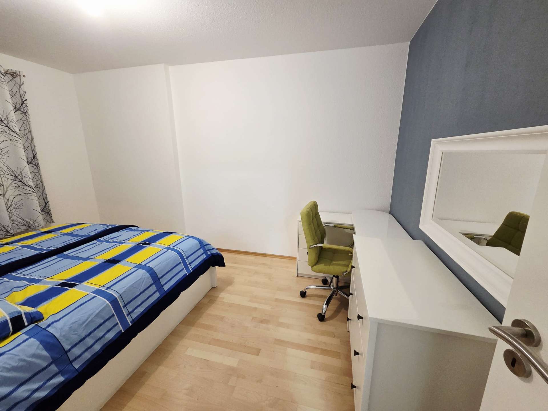 Das Hauptschlafzimmer bietet ausreichend Platz für ein großes Doppelbett (180 cm), eine Kommode mit Spiegel sowie einen kleinen Arbeitsbereich. Das zweite Schlafzimmer eignet sich ideal als Kinder-, Gäste- oder Arbeitszimmer und ist mit Schreibtisch, Bücherregal, Kleiderschrank sowie einem klappbaren Gästebett (90 cm) ausgestattet. Von hier aus kommt man auf den Balkon (ca. 6 m²) zur Rückseite des Hauses.