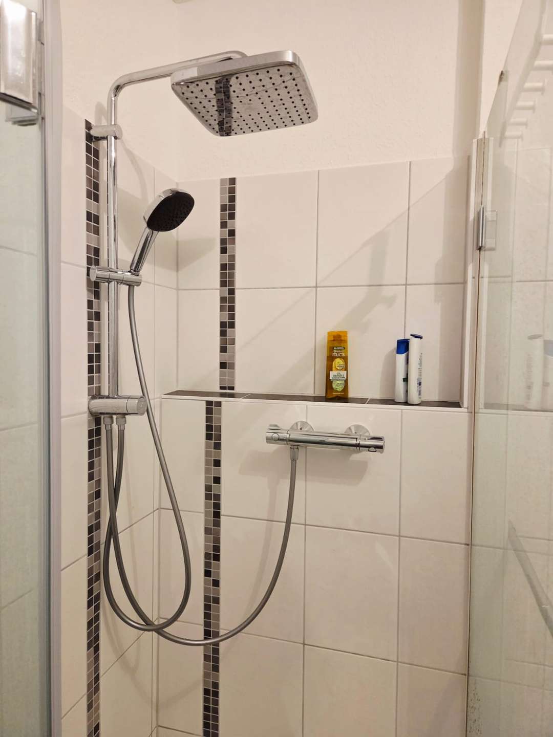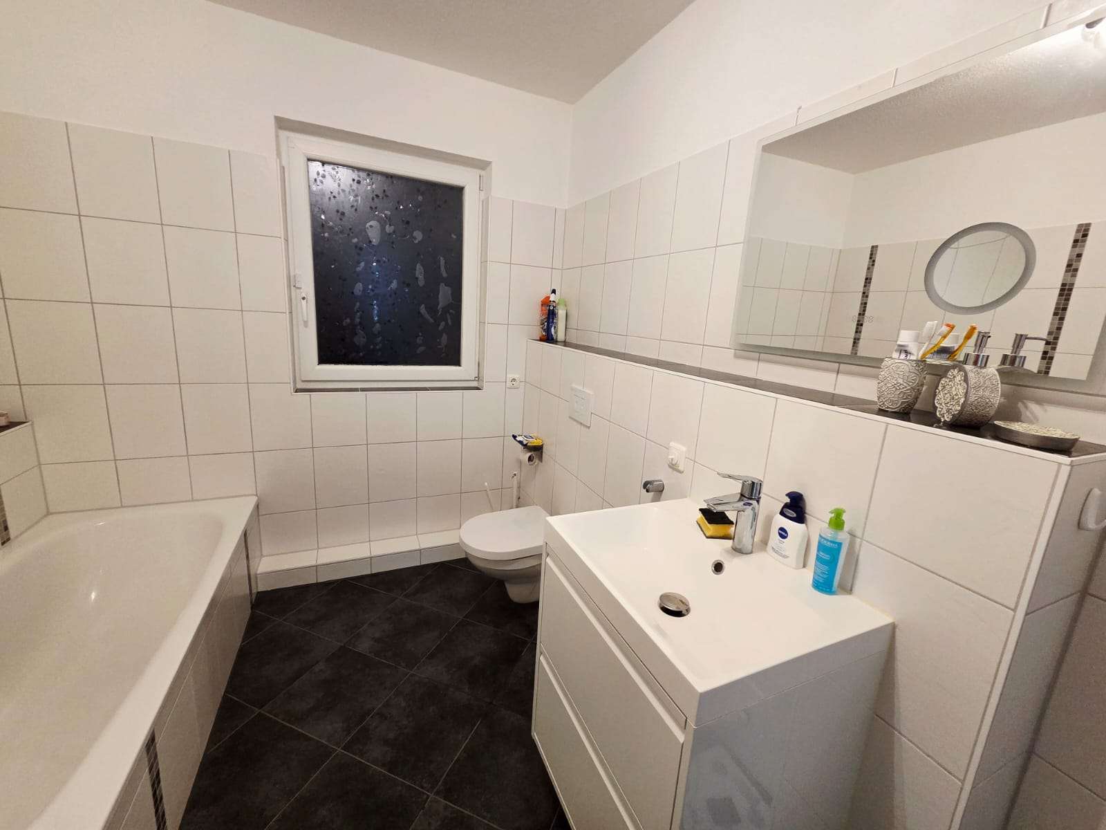 Das moderne Badezimmer mit Fenster ist mit einer Dusche mit Rainshower, einer Badewanne, WC, Waschtisch und einem Handtuchheizkörper ausgestattet. Die Wohnung verfügt über eine Abstellkammer, die Platz für eine Waschmaschine bietet.