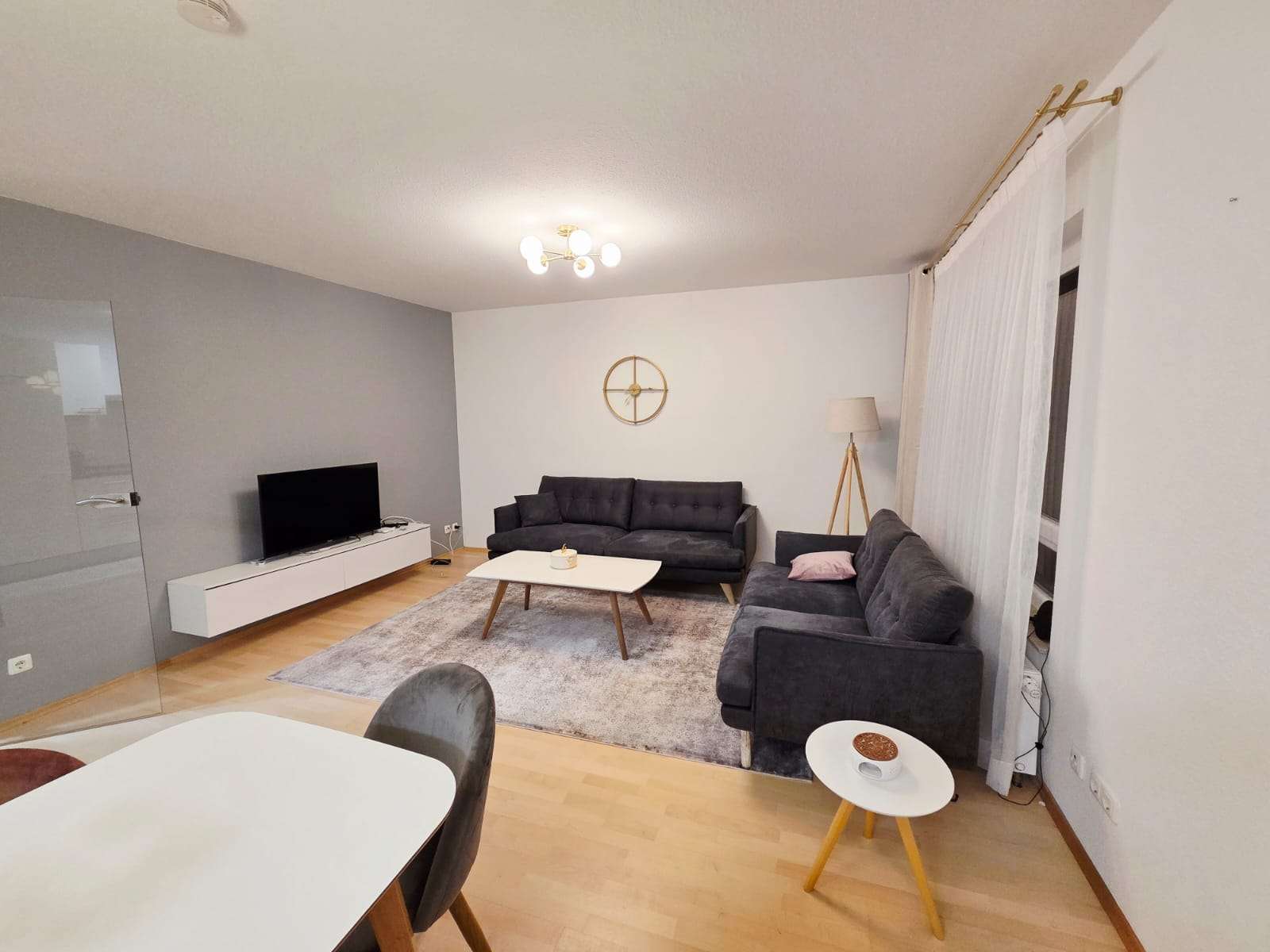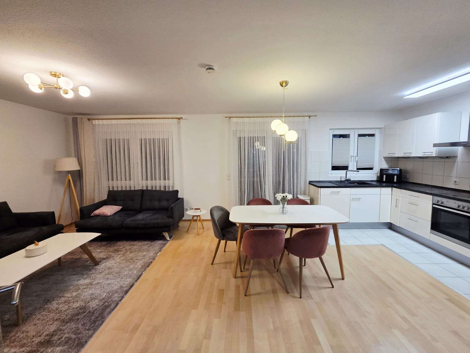 Der helle Wohnbereich ist vollständig modern möbliert und überzeugt durch eine komfortable Einrichtung mit Fernseher inklusive Satellitenanschluss, zwei Sofas (3- und 2-Sitzer) sowie einem Esstisch mit sechs Stühlen. Die offene Küche ist komplett ausgestattet und funktional in den Wohnraum integriert. Vom Wohnzimmer kommt man auf einen kleinen Balkon (ca 6 m²), von dem aus man die Sonne genießen kann.