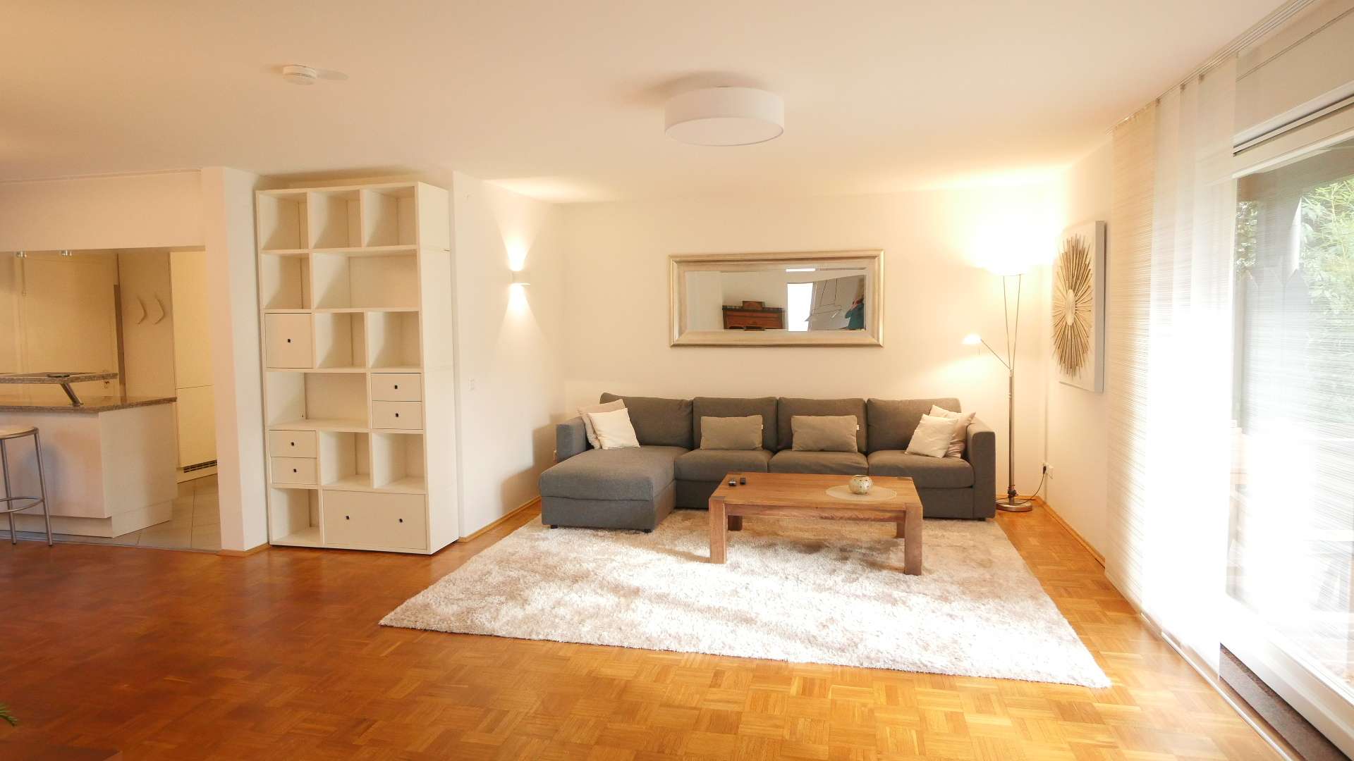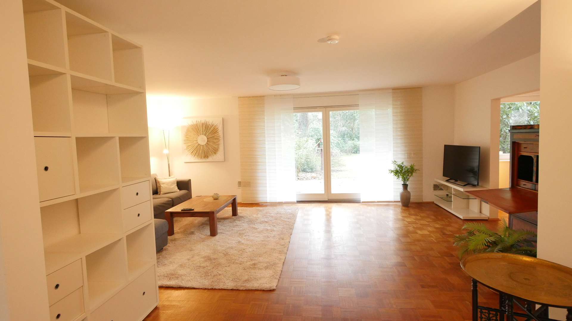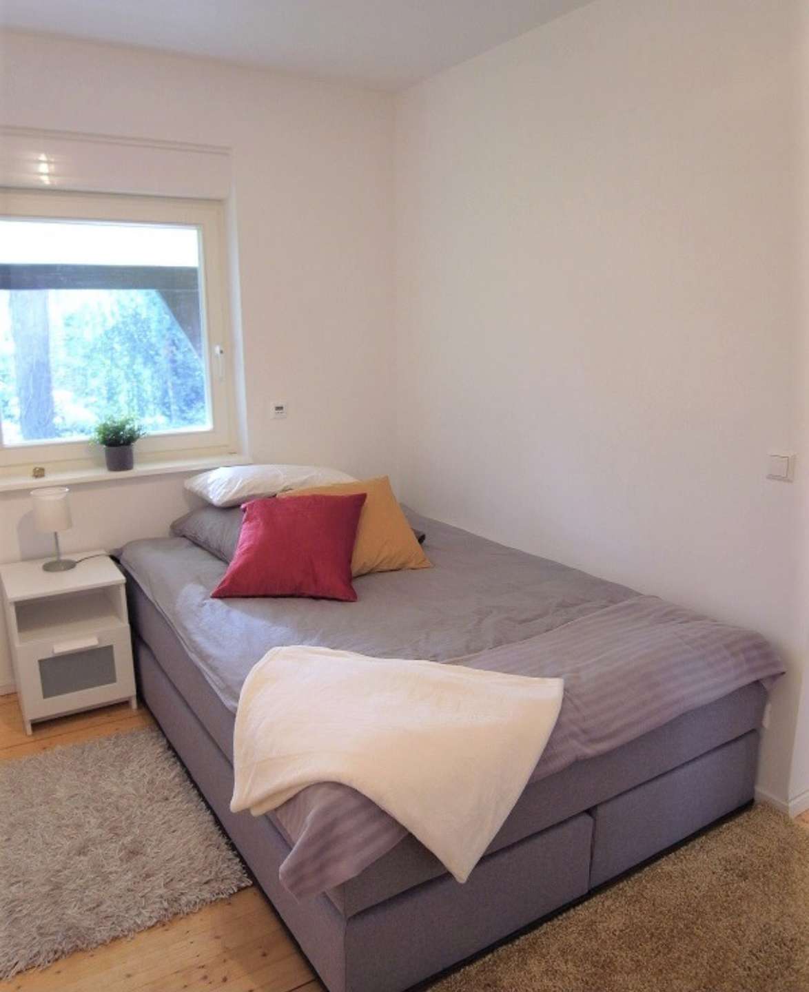 Ein großes Schlaf-/Kinderzimmer, welches in einen Wohnbereich und einen Schlafbereich aufgeteilt ist und Zugang zum Balkon mit Blick auf den schönen Garten bietet.