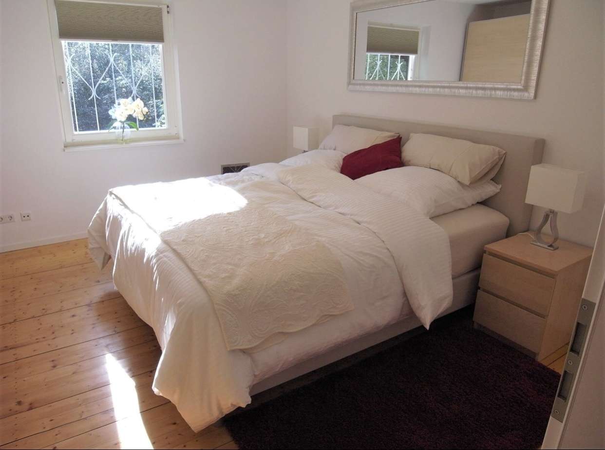 Im Obergeschoss befinden sich das helle Elternschlafzimmer mit Doppelbett und Einbaukleiderschrank.
