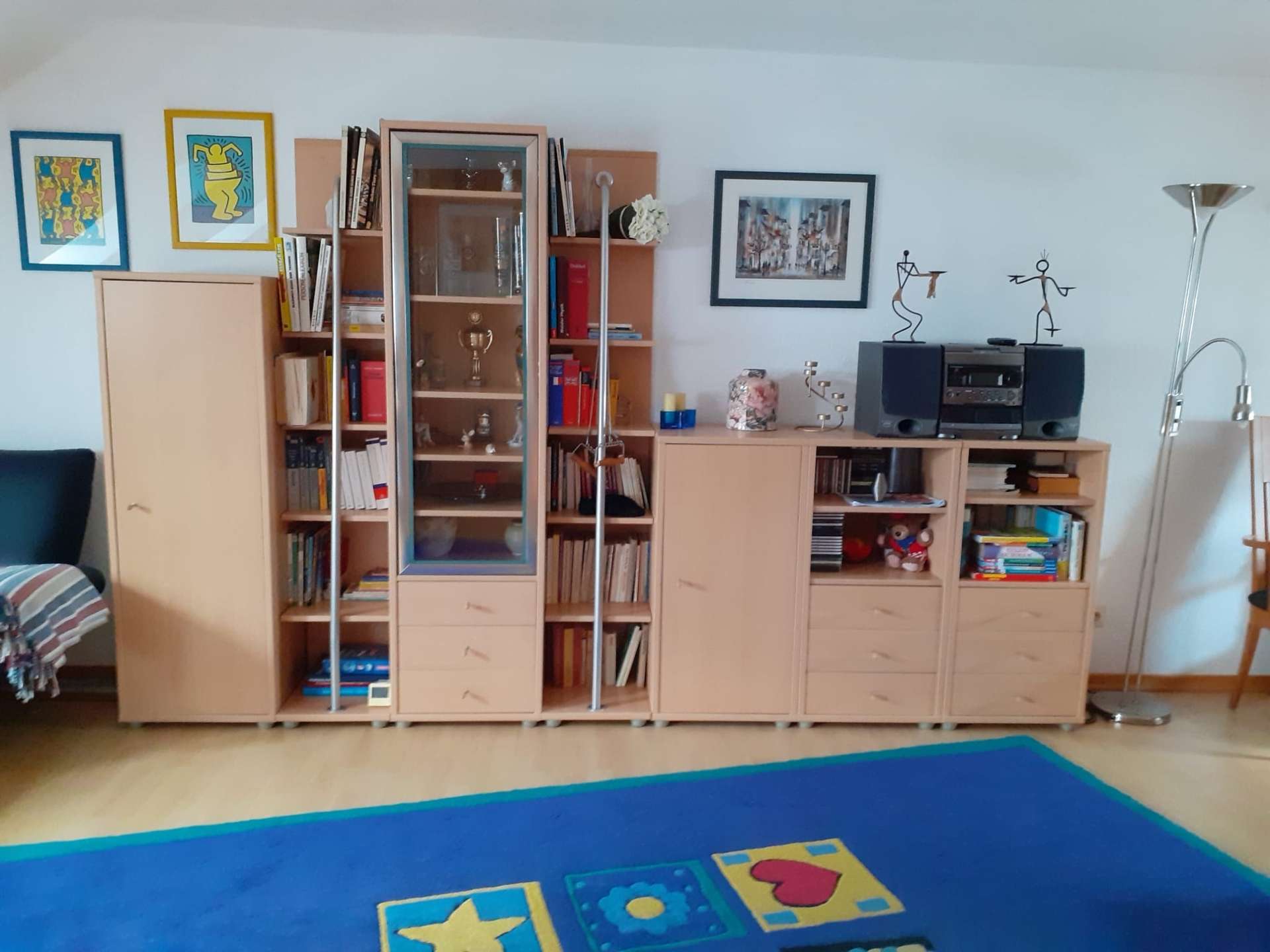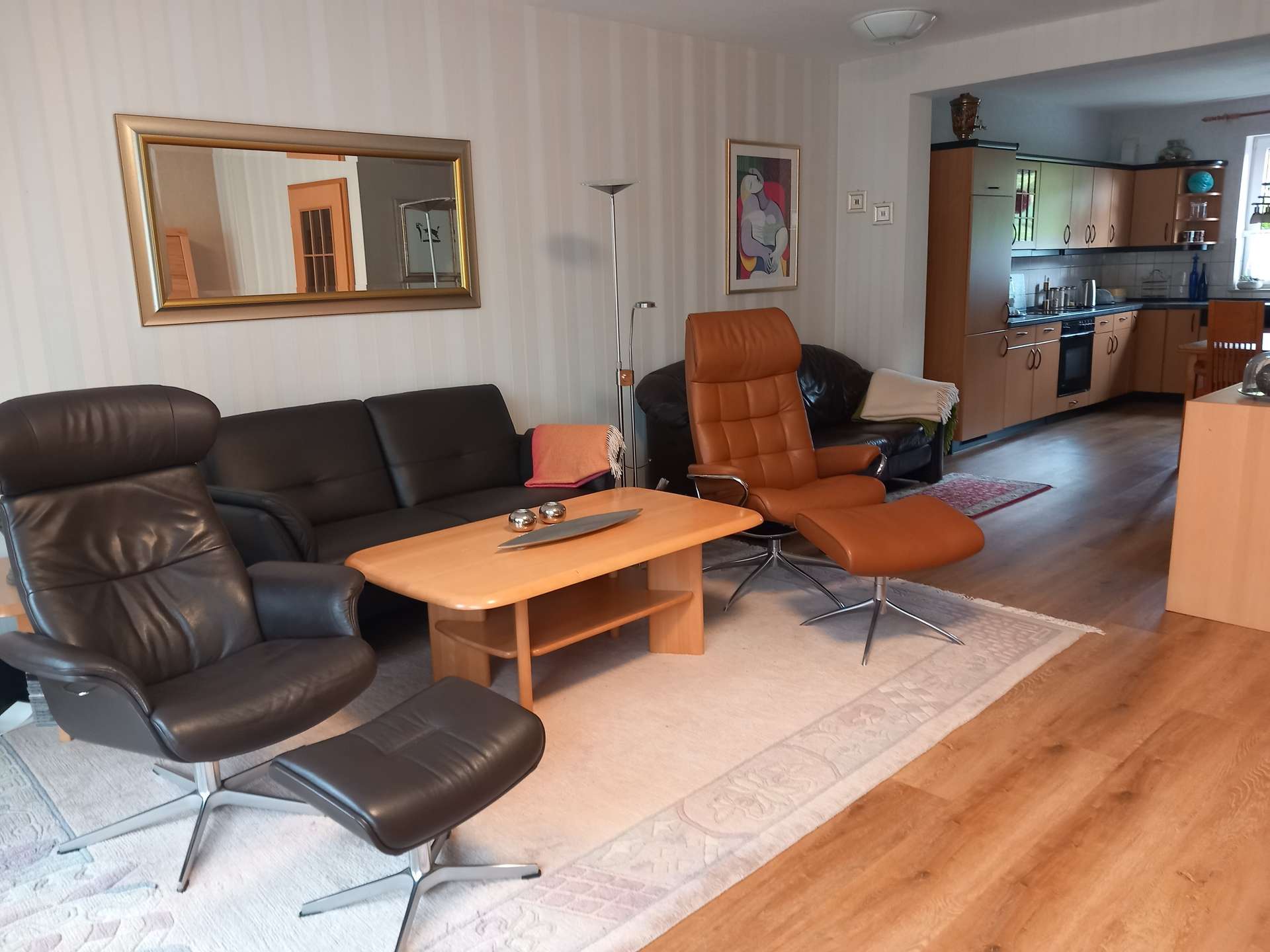Im Erdgeschoss befindet sich der offen gestaltete Wohn- und Essbereich mit direktem Zugang zur Terrasse und dem Garten. Eingerichtet ist der Wohnbereich mit einem Leder Sofa, zwei Ledersesseln, Beistelltisch, Fernseher mit Sideboard sowie einem Teppich und Schränken für zusätzlichen Stauraum.
