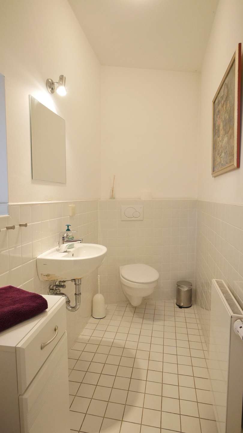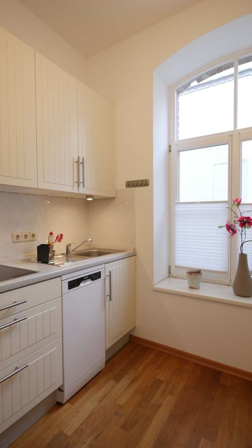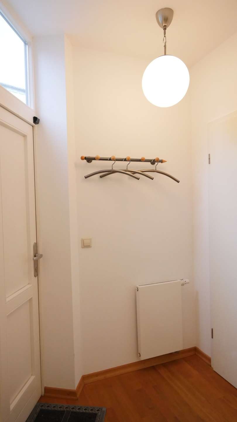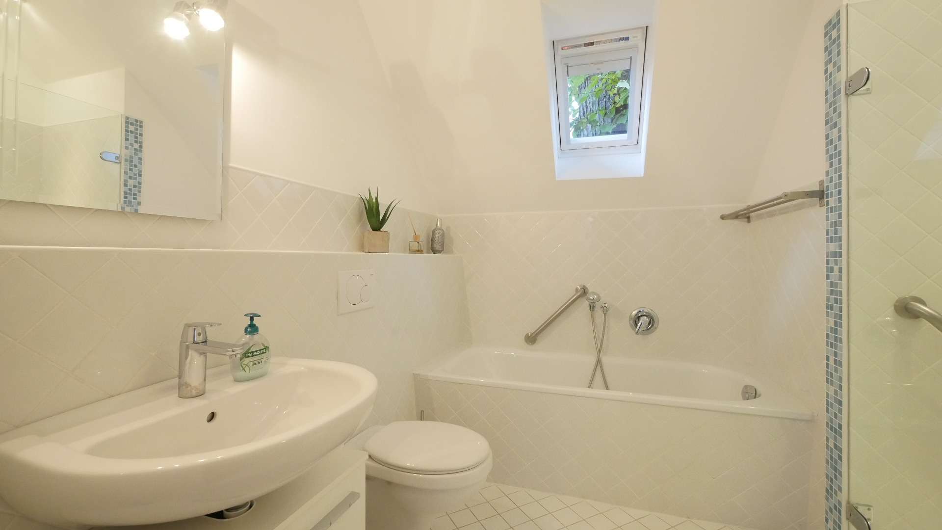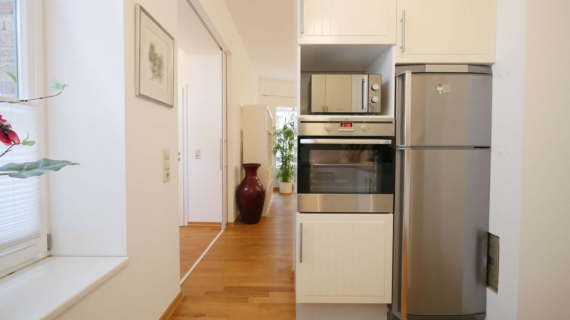 Sehr elegant möblierte Wohnung. Im Erdgeschoss befinden sich das elegante Wohnzimmer, ausgestattet mit großzügigem Ecksofa, Beistelltischen, Regal, Flachbild-TV und kleinem Esstisch mit 2 Stühlen, das Gäste-WC mit Waschmaschine und die moderne Küche. Die Küche verfügt über ein 4-Platten-Ceranfeld, einen separaten Backofen, Mikrowelle, Geschirrspüler, Kühl-Gefrierkombination, Spüle sowie alle notwendigen Küchenutensilien. Im 1. OG, zugänglich über eine Treppe aus dem Wohnzimmer, befinden sich das große Schlafzimmer mit Doppelbett, ein Schrankzimmer sowie das Badezimmer mit Badewanne, separater Dusche, Waschtisch und WC. Fliesen in den Bädern, ansonsten gepflegter Parkettboden. Neben der Eingangstür befindet sich eine Terrasse zur Alleinnutzung.